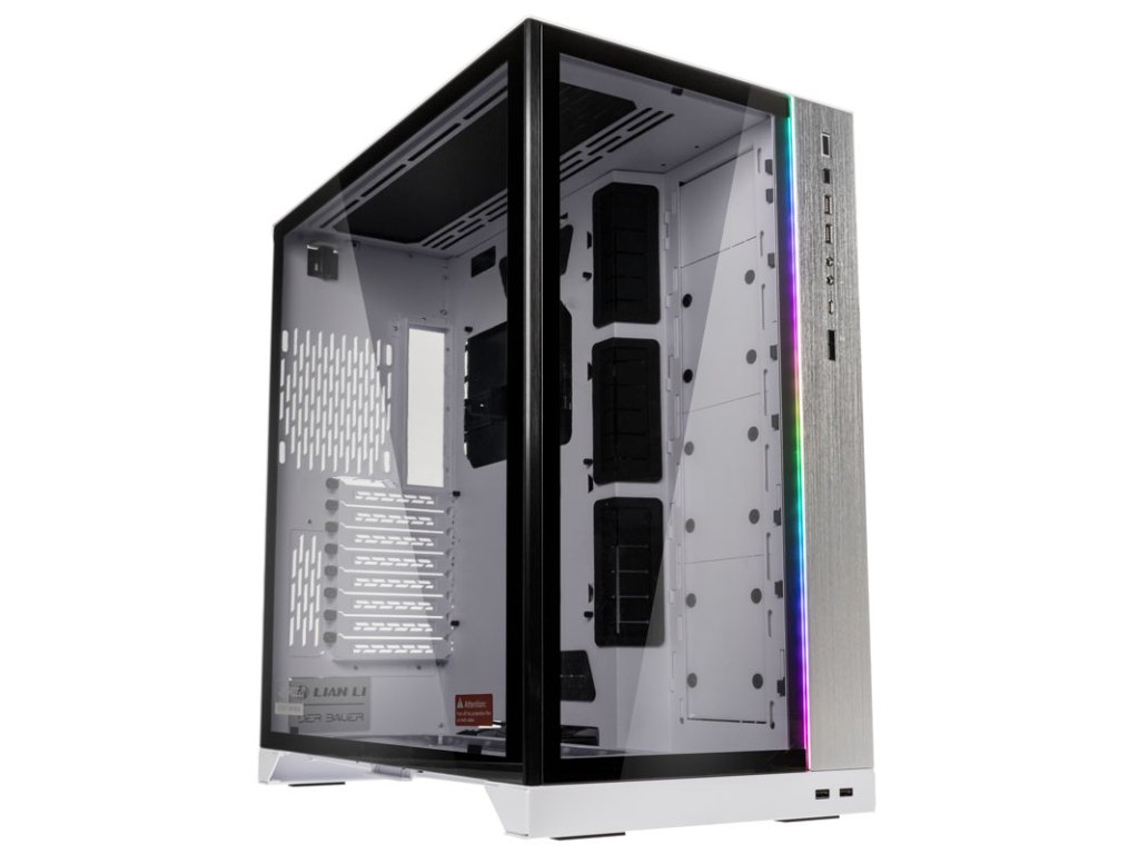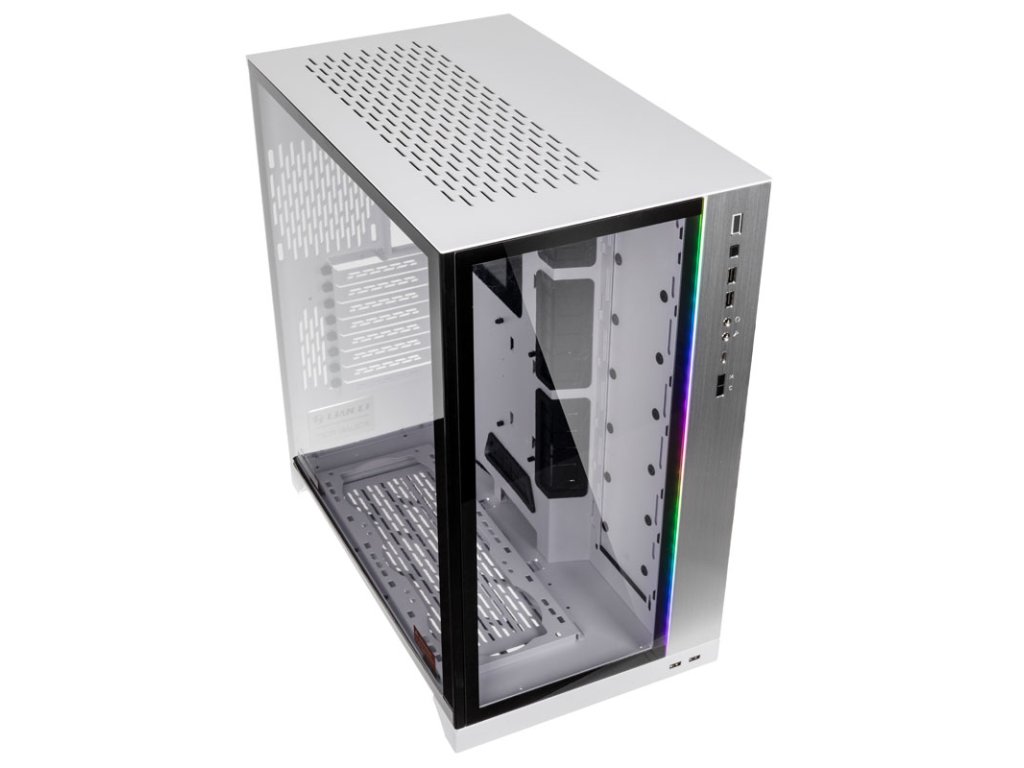 S modulárnymLian Li O11Dynamic XL (ROG Certified) Big Tower oceľ je dômyselne skombinovaná s bočným panelom z tónovaného tvrdeného skla. Spoločnosť Lian Li však ide ešte o krok ďalej a pravý bočný panel a veko vybavila1 milimeter hrubý hliník von. Predná časť je tiež vyrobená z tvrdeného skla a spolu s bočným panelom umožňuje takmer nerušený výhľad do vnútra krytu.Na pravej strane prednej časti sa nachádza I/O panel sjeden port USB 3.1 typu C, dva porty USB 3.0 a dve povinné zvukové pripojenia. Dvaďalšie porty USB 3.0 sa nachádzajú na pravom konci predného panela. Medzi I/O panelom a sklom z tvrdeného skla sa nachádzadiskrétny RGB LED pásikktorý sa tiahne zhora nadol a ktorého osvetlenie možno ovládať pomocou dvoch prepínačov na paneli. Alternatívne možno pásik RGB LED pripojiť aj k bežnému slotu 5VDG na vhodne vybavenej základnej doske.