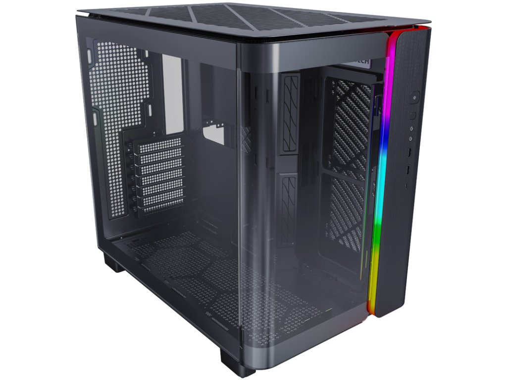 Okrem portu USB-C a dvoch portov USB 3.0, ako aj 3,5 mm konektora pre mikrofón a slúchadlá sa na bočnom paneli IO pred druhou komorou nachádza aj prepínač na ovládanie osvetlenia. Kryt druhej komory je orámovaný prúžkom ARGB. Táto PRO verzia Montech KING 95 sa dodáva s rozbočovačom na ovládanie osvetlenia a rýchlosti ventilátora.
