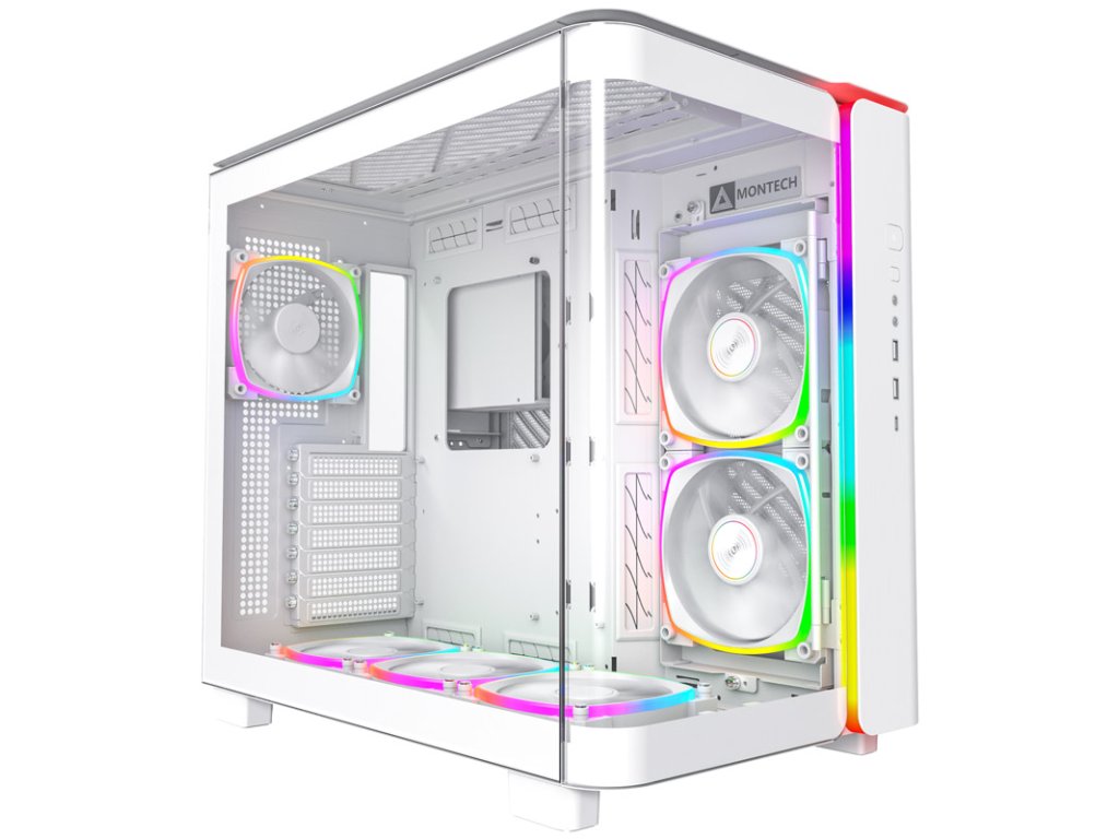 Montech KING 95 PRO ponúka dostatok priestoru pre sofistikovaný herný hardvér. Podporované sú základné dosky až do formátu ATX. Pripojené grafické karty môžu mať dĺžku až 420 mm. Do druhej komory za šachtou pre základnú dosku možno umiestniť až dve napájacie jednotky. K dispozícii je 35 mm priestoru na správu káblov. K dispozícii je aj klietka pre dva pevné disky alebo tri disky SSD. Dva disky SSD je možné pripojiť aj k zadnej časti zásobníka základnej dosky. Tri disky HDD alebo SSD je možné umiestniť aj v spodnej časti namiesto ventilátorov.