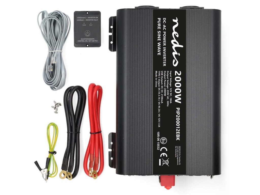 NEDIS měnič napětí/ čistá sinusoida/ 12 V DC/230 V AC 50 Hz/ 2000 W (4000 W špička)/ USB-A / USB-C/ 2x zásuvka typu E