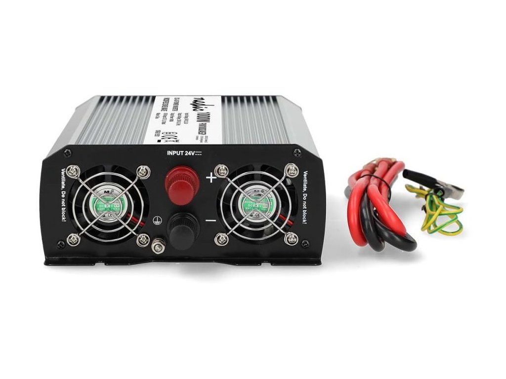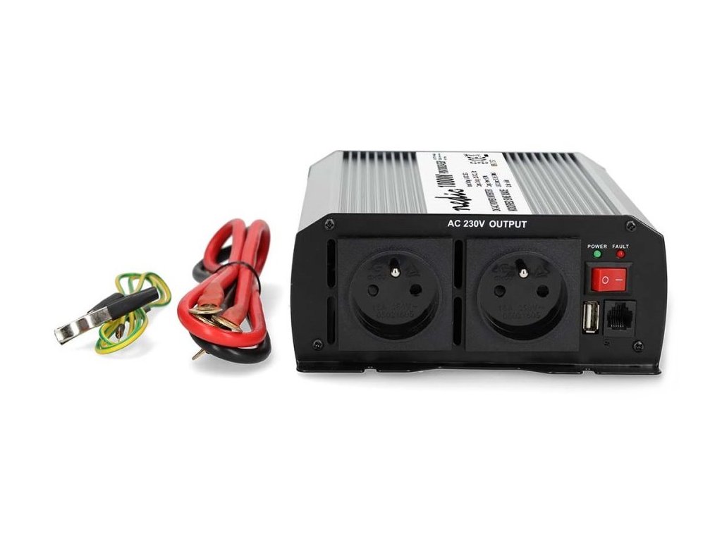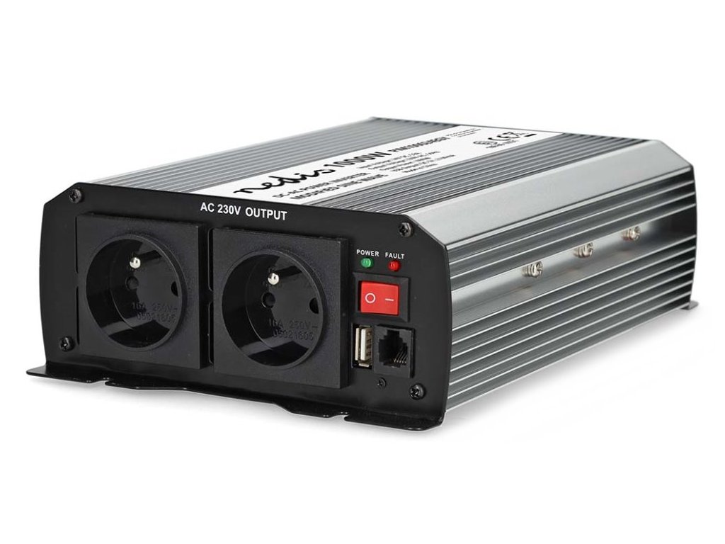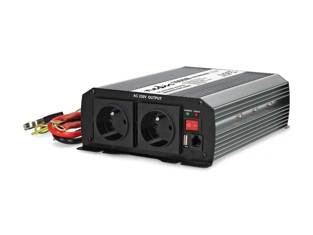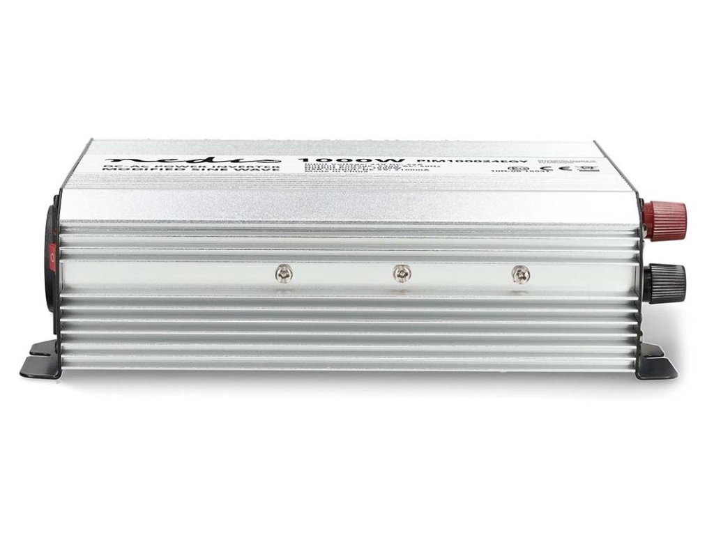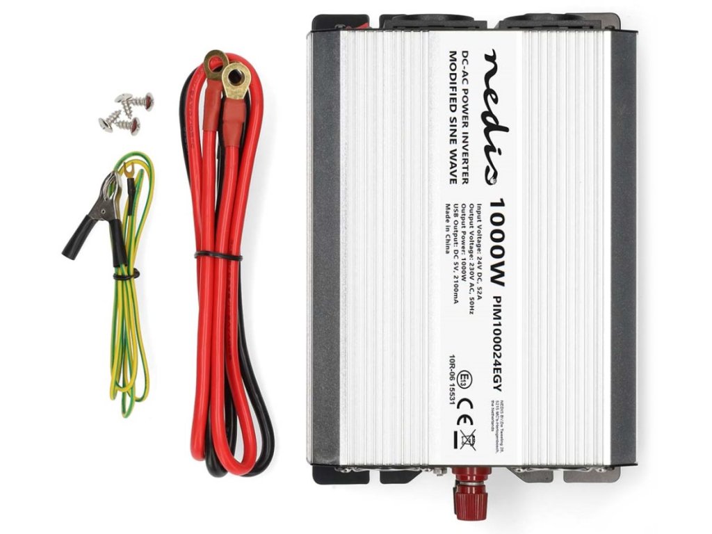 Nedis PIM100024EGYMěnič napětí s výkonem 1000 W a modifikovanou sinusoidou je ideální řešení pro napájení nejrůznějších elektrických spotřebičů určených pro síťové napájení, jako například notebooků, chladicích boxů apod. Vstupní napětí měniče je 24 V DC, výstupní napětí 230 V AC a účinnost 85 %. Takto můžete v nákladních automobilech, lodích či obytných vozech používat domácí spotřebiče, aniž byste museli investovat do speciálního vybavení pracujícího s napětím 24 V. Není vhodný pro napájení elektroniky citlivé na tvar vstupního napětí. Měnič je vybaven dvěma napájecími zásuvkami se zemnicím kolíkem (typ E) a jedním USB portem s výstupním napětím 5 V DC. Samozřejmostí je ochrana proti přehřátí, přetížení, zkratu, přepólování (pojistka), podpětí a přepětí. Součástí balení jsou kabely s očky pro připojení k baterii.