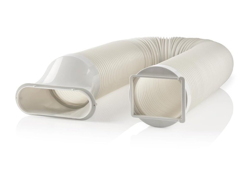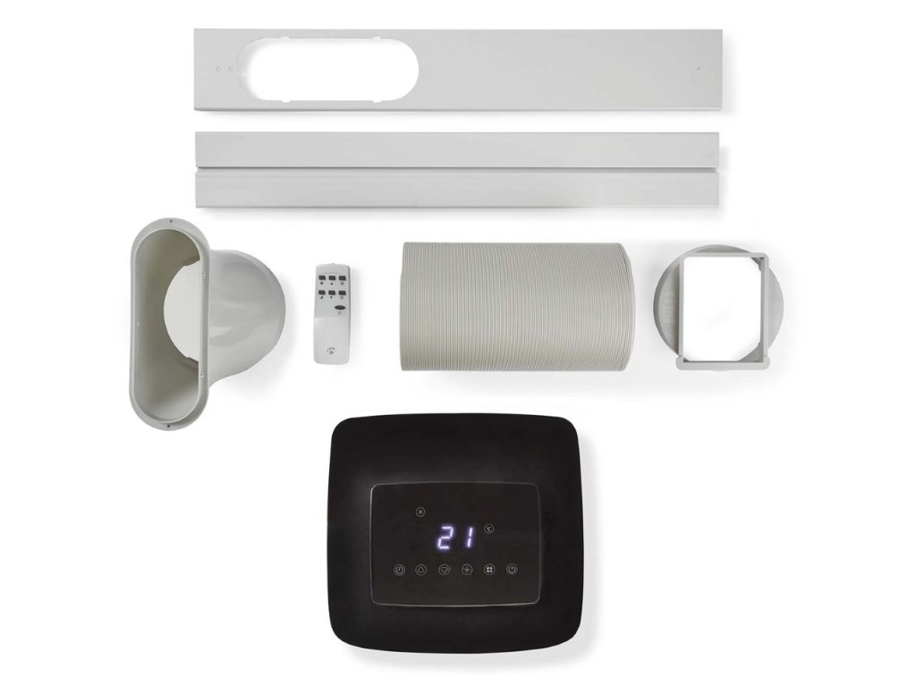 Součástí balení je dálkové ovládání, hadice o délce 1,5 m pro odvod tepla, 2× nástavec na hadici a okenní sada.