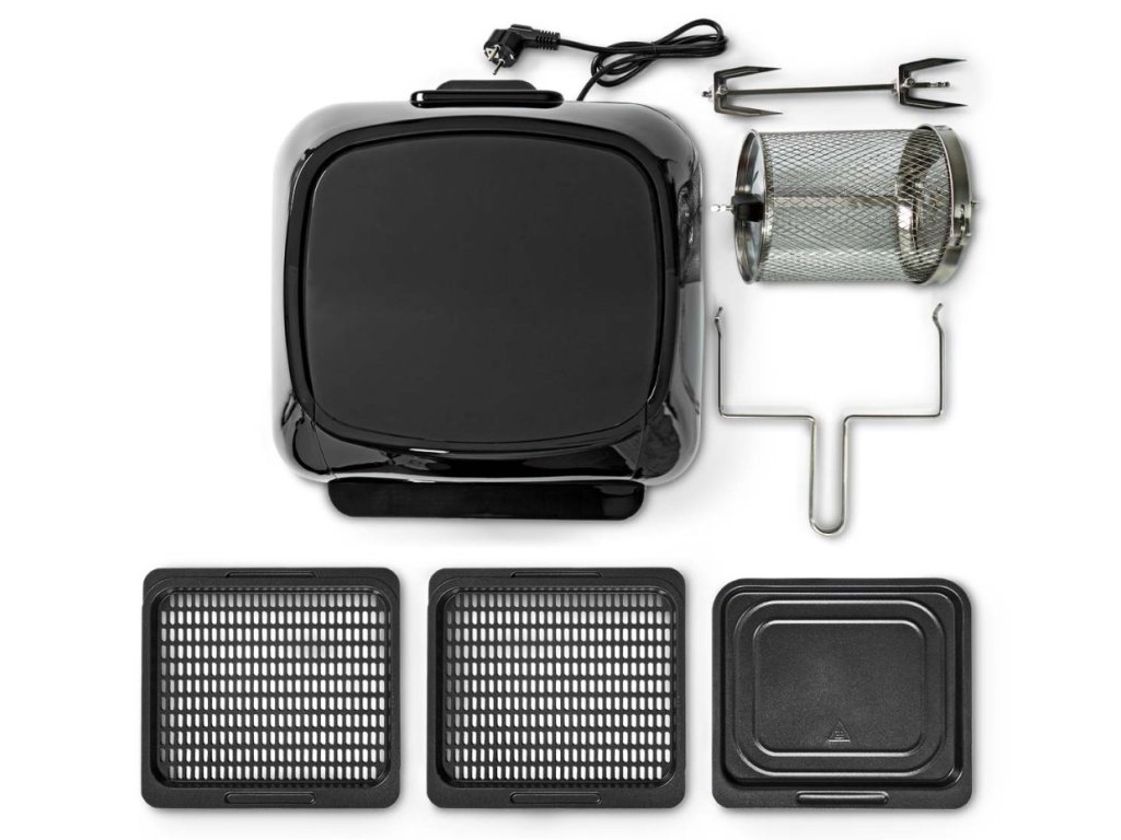 Součástí balení je pečicí deska/deska pro odkapávání oleje, 2× grilovací mřížka, rožeň na kuře, držák rožně a rotační bubnový koš.