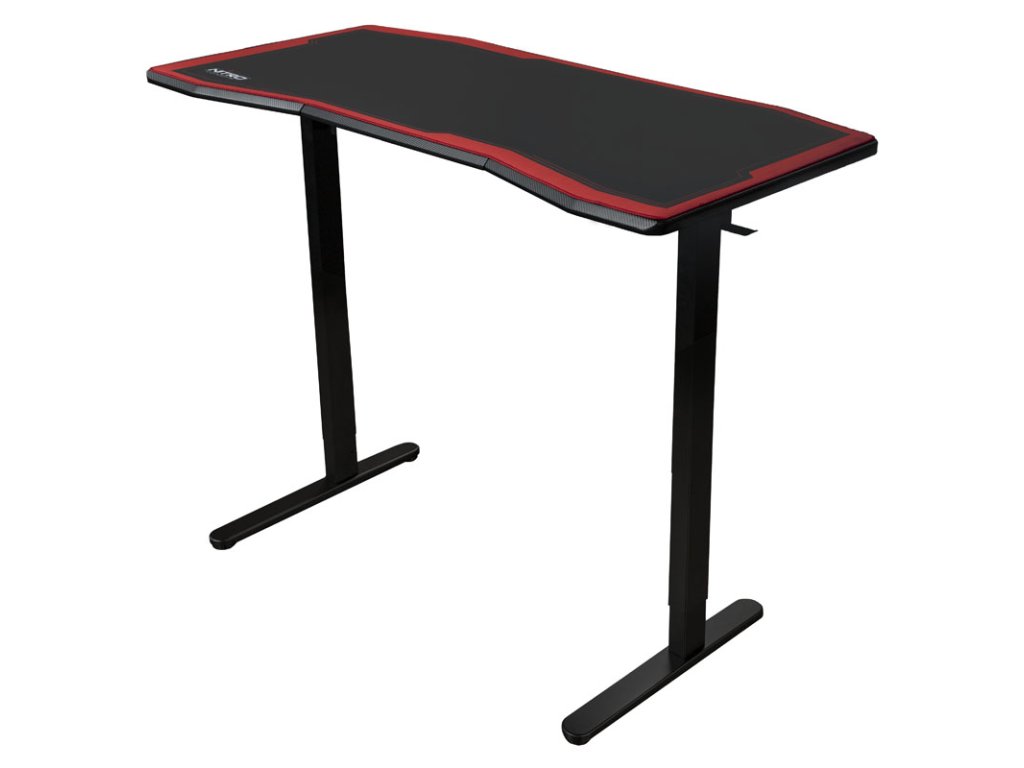 Trojsegmentový rám s hrúbkou 25 milimetrov je namontovaný na pevnom, ale štýlovom oceľovom rámeVrchná časť z robustného materiálu MDF s jemným plastovým povrchom v karbónovom vzhľade. Doska stola je opäť zakončená výraznou čiernou a červenou farbouStolová podložka s povrchom z mikrotkanej textílie ktorý je navrhnutý s ohľadom na odolnosť. Možno na nej používať myši so všetkými bežnými snímačmi, čo znamená, že podložku pod myš je potrebné používať len z estetických dôvodov. Vďaka dĺžke 160 cm a šírke 80 cm je na stole okrem myši a klávesnice stále dostatok miesta až pre tri monitoryHerný stôl D16M od spoločnosti Nitro Concepts.Vonkajšie segmenty stolovej dosky sú mierne natočené dovnútra a poskytujú optimálny uhol pre monitory umiestnené na boku. Prostredníctvom celkomtri okrúhle výrezy vpravo, vľavo a v strede umožňujú vedenie káblov zhora nadol do počítača. Na boku jeDržiak na náhlavné súpravy ktorý je súčasťou balenia.