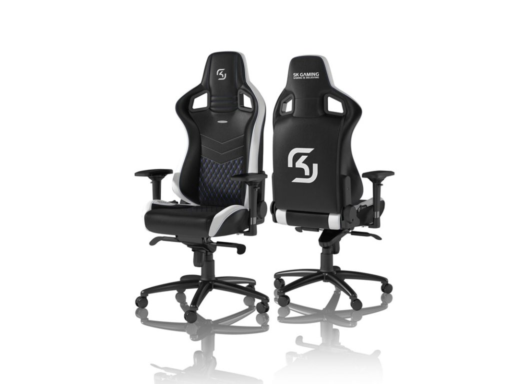 Biele a modré šitie na švoch a operadle bolo utkané s mimoriadnou presnosťou pomocou priemyselných vyšívacích strojov a vytvára elegantný kontrast k čiernej PU umelej koži, ktorú šikovne zvýrazňuje biely rám. Dizajn hráčskeho trónu dotvára diskrétna oválna hliníková plaketa s nápisom Noblechair vo výške ramien a vyrazené logo "SK Gaming" vo výške hlavy.