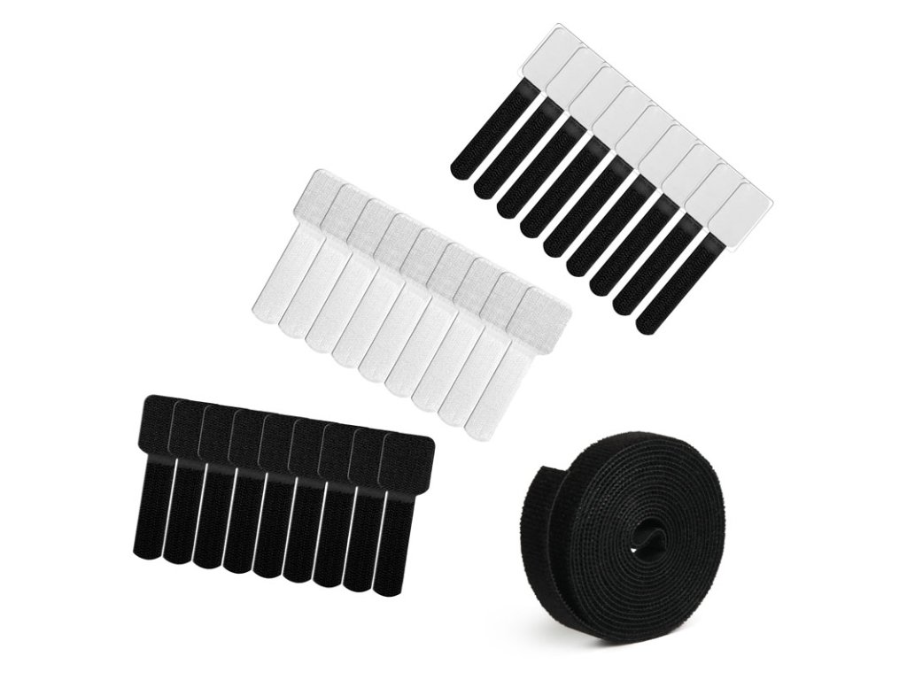 Tento praktický balík obsahujetri metre obojstrannej pásky s háčikom a slučkou,desať čiernych mini káblových viazačov s háčikom a slučkou a každýdesať držiakov káblov na suchý zips v čiernej a bielej farbe so samolepiacou podložkou. na montáž na stenu alebo skrinku. Pásky sa dajú skrátiť na dĺžku podľa individuálnych požiadaviek. To znamená, že je možné ovinúť aj celé zariadenia vrátane káblov.