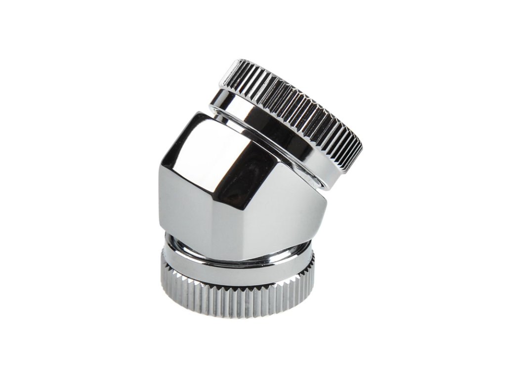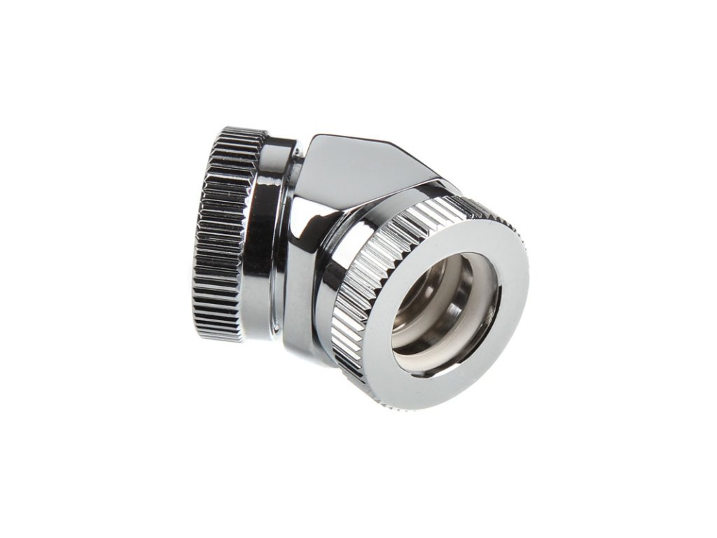 Na pripojenie jednotlivých komponentov systému vodného chladenia je nevyhnutné zvoliť správne prípojky a ich dostatočný počet. Inak sa inštalácia môže rýchlo stať frustrujúcou skúsenosťou, ak montáž zlyhá kvôli nesprávnym alebo príliš malému počtu konektorov a v dôsledku toho sa oneskorí.Ide o pochrómovaný adaptér na predĺženie prípojok v systémoch vodného chladenia. Adaptér je spojka na spojenie dvoch tvrdých rúrok s vonkajším priemerom 12 mm pod uhlom 45 stupňov. Spojovacie matice sú vyrobené z hliníka a dva gumové krúžky na každej strane zabezpečujú tesnenie.