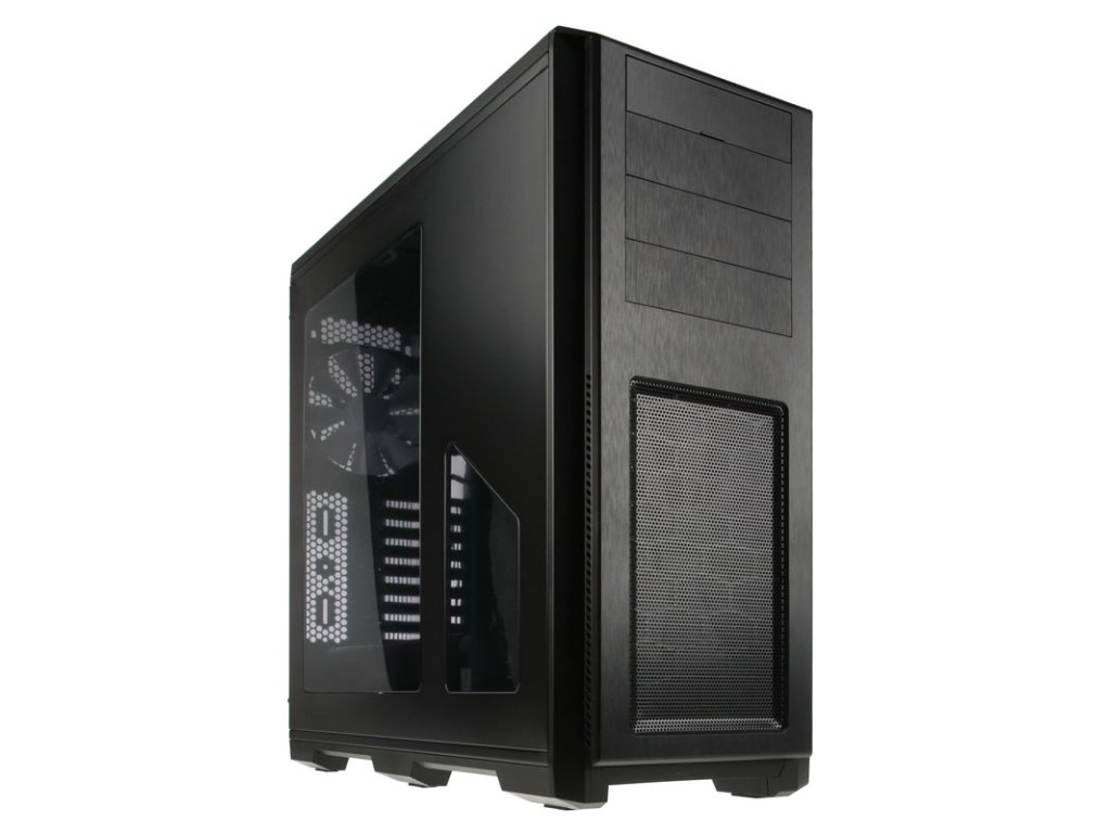 Podobne ako model Primo, aj tu ponúkaná okenná verzia čierneho modelu Enthoo Pro má v prednej časti menšie okno, za ktorým sa na uzavretej priehradke na disk nachádza štýlový nápis PHANTEKS. Pohľad cez veľké hlavné okno odhaľuje množstvo pogumovaných káblových priechodov, ako aj samostatnú uzavretú komoru pre napájaciu jednotku ATX, ktorá nasáva čerstvý vzduch zospodu a nevyžaruje svoje teplo do ostatných častí v midi tower.