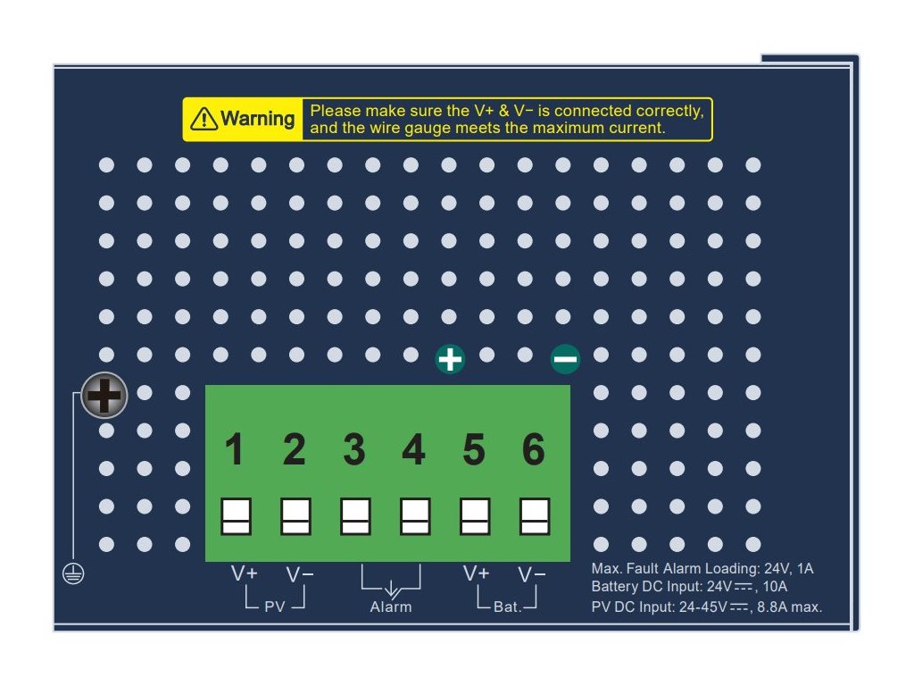 - Vstupní napájení (PV IN): min. napětí 24 V (doporučujeme > 30 V pro plné nabití baterie), max. 45 V, max. proud 8,8 A, příkon do 400 W