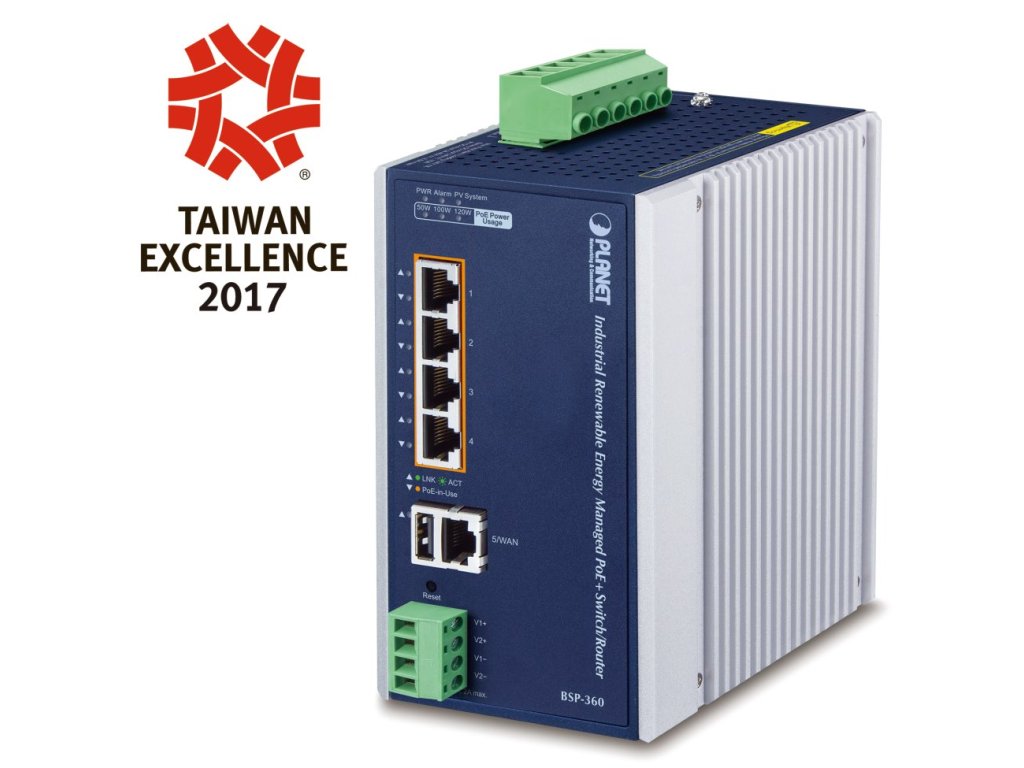 PLANET BSP-360 v3Solární napájecí PoE+ router s přepínačem (switch) a integrovaným MPPT regulátorem, 4x RJ-45 10/100/1000 Base-T s PoE+ IEEE 802.3af/at (36 W/port), 120 W PoE budget, 1x RJ-45 10/100/1000 Base-T (WAN v Gateway režimu), 1x USB (záloha konfigurace).