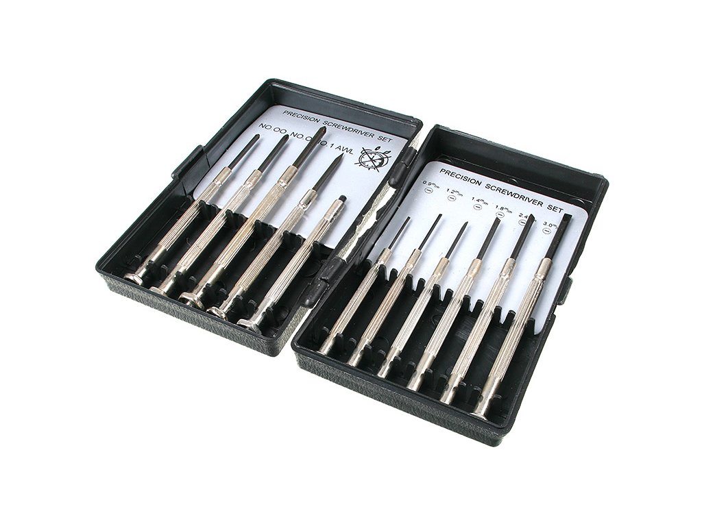 - 6x drážkové skrutkovače (0,9 mm; 1,2 mm; 1,4 mm; 1,8 mm; 2,4 mm; 3 mm)