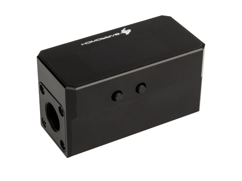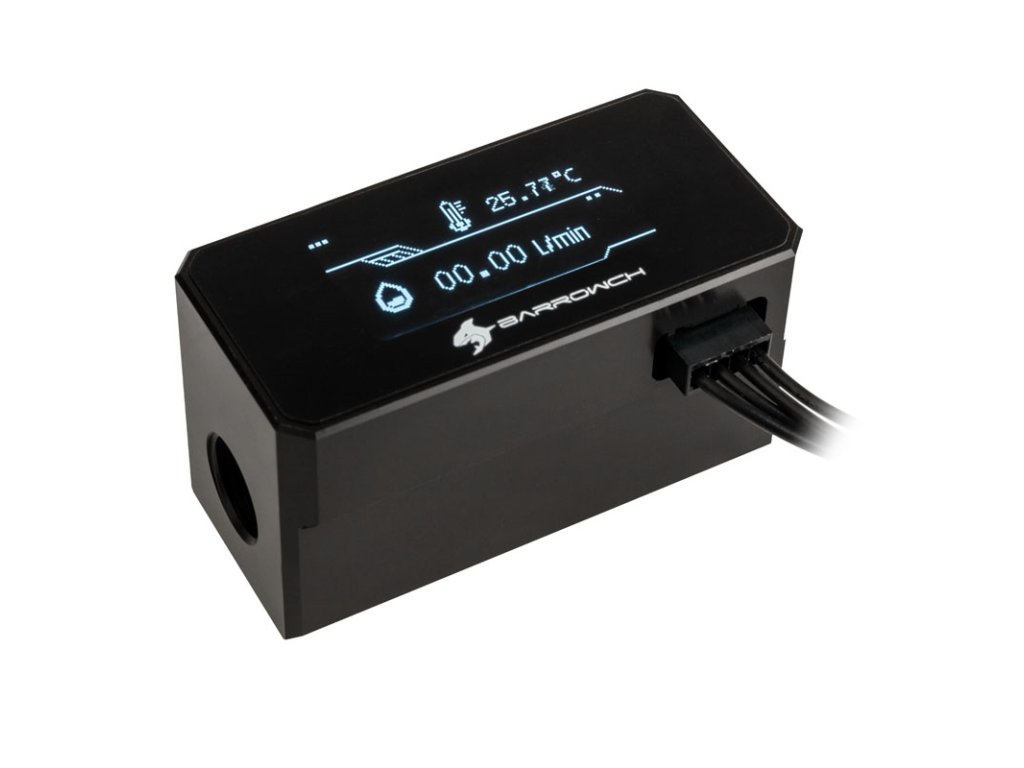 NaPrietokomer Barrow OLED je Indikátor prietoku s displejom. Vďaka tomu je možné rýchlo a jednoducho skontrolovať, či je prietok chladiacej kvapaliny normálny, alebo či sú problémy s čerpadlom. Môžete tiež neustále sledovať teplotu chladiacej kvapaliny.