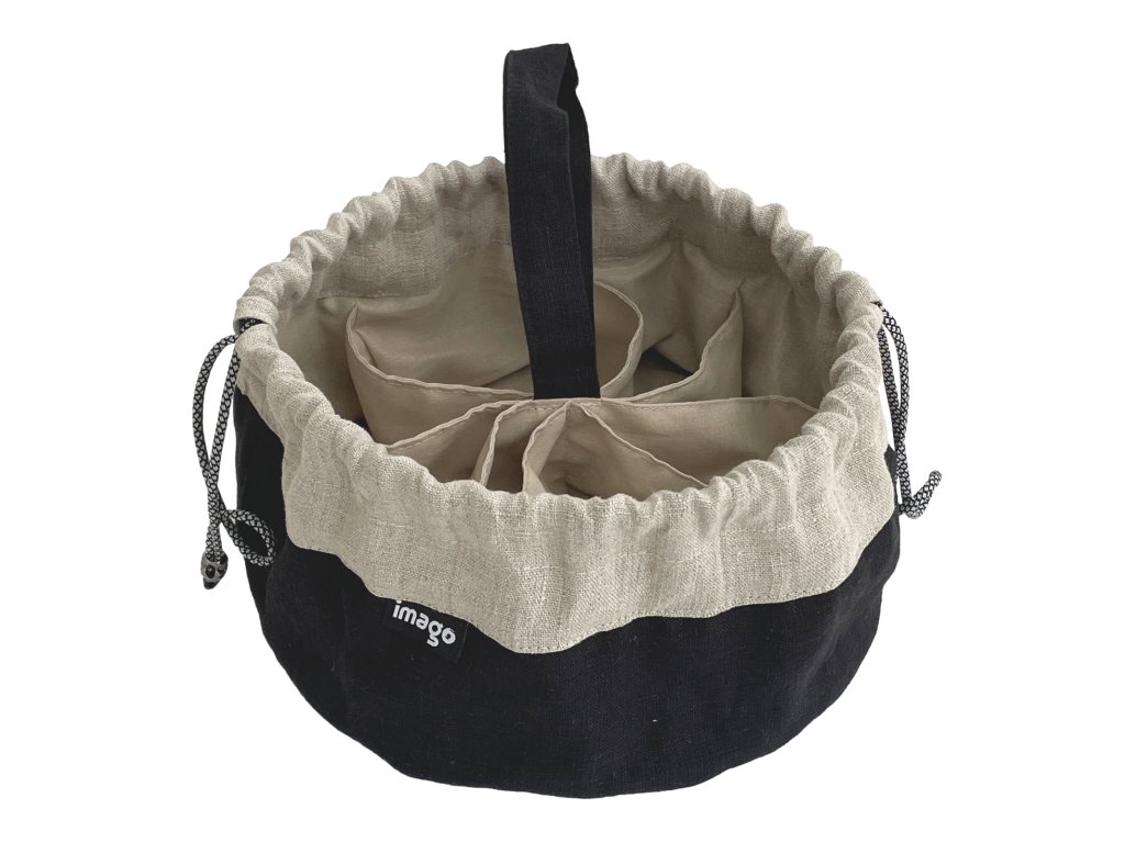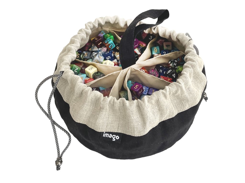 Obří vak na kostky od imago pojme přes 500 kostek díky osmi vnitřním kapsám. Každá kapsa je pevně prošitá a chrání tvé oblíbené kousky před poškozením či ztrátou. Vak je přehledný – vždy najdeš přesně tu správnou sadu kostek, které potřebuješ. Vak (váček by v tomto případě byla tak trochu urážka…) je vyrobený z pevného plátna s polstrováním, takže sám drží tvar a zůstává na stole otevřený. Zavírá se stahovacími šňůrkami a je opatřen i pevným středovým poutkem pro snadnou manipulaci a přenášení. Vnitřní přihrádky jsou ze 100 % bavlněného plátna. Dno je vypolstrované rounem. Vnější obal je ze 100% lnu. Šňůrky jsou opatřeny na koncích kovovými koncovkami. POZOR! Koncovky ve tvaru lebky jsou pouze na černé variantě. Průměr vaku je 26 cm, výška 15 cm.Diskusia