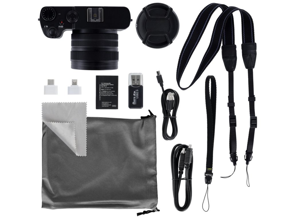 Součástí balení je fotoaparát Powerflex X8 Dual Lens, baterie, USB-C kabel, HDMI kabel, adaptér USB na USB-C, adaptér USB na micro USB, adaptér USB na microSD, poutko na ruku, popruh na nošení, čisticí hadřík, úložný sáček a uživatelská příručka.