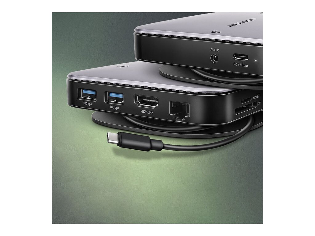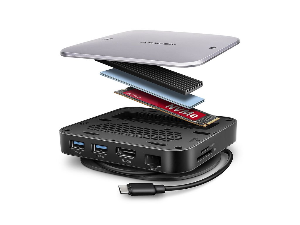 Rozbočovač AXAGON HMC-UFO USB-C, M.2 SATA/NVMe, 1 Gbit/s Ethernet, 384 kHz zvuk - čierny/strieborný