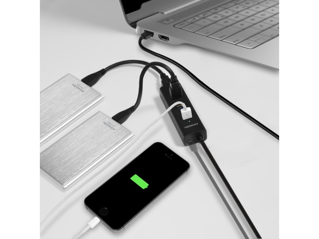 StránkaAXAGON HUE-S2BL je kompaktný a ľahký rozbočovač USB-A, ktorý ponúka celkomštyri porty USB a vďaka štandardu USB 3.0 ponúkaRýchlosť prenosu dát max. 5 Gbit/s. Vďaka prúdu až 0,9 A na port možno nabíjať aj mobilné zariadenia.O aK portu micro USB možno pripojiť voliteľnú nabíjačku s prúdom 2 A. Jeden port potom dodáva nabíjací prúd 2 A podľa normy USB Battery Charging 1.2 alebo napája niekoľko externých 2,5-palcových diskov súčasne. To znamená, že pripojený smartfón možno dokonale ovládať myšou a klávesnicou a zároveň nabíjať, takže je vhodný na kancelársku prácu a hranie hier.