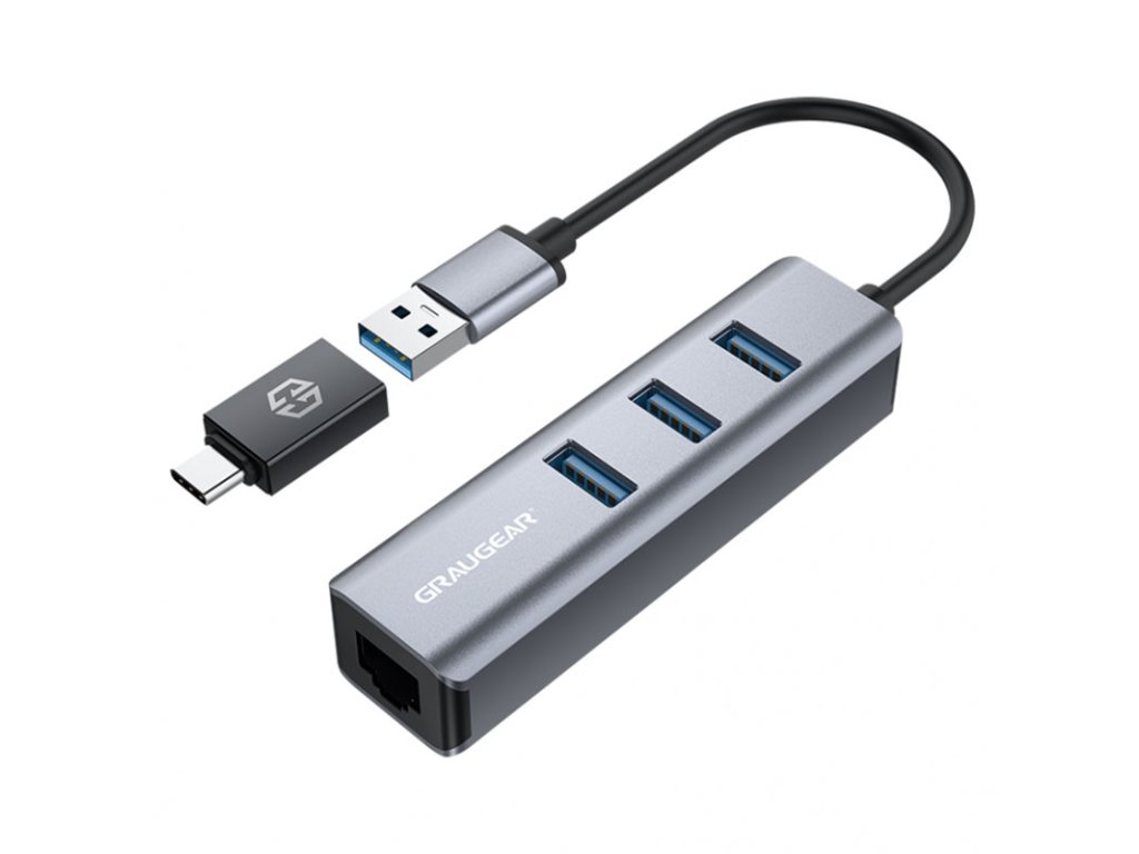 Rozbočovač USB Graugear, 3x USB 3.0 Type-A Gbit LAN, vrátane adaptéra USB-C - strieborný