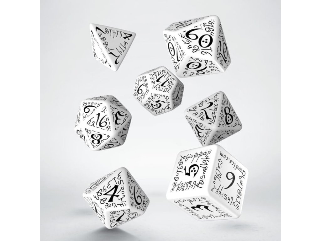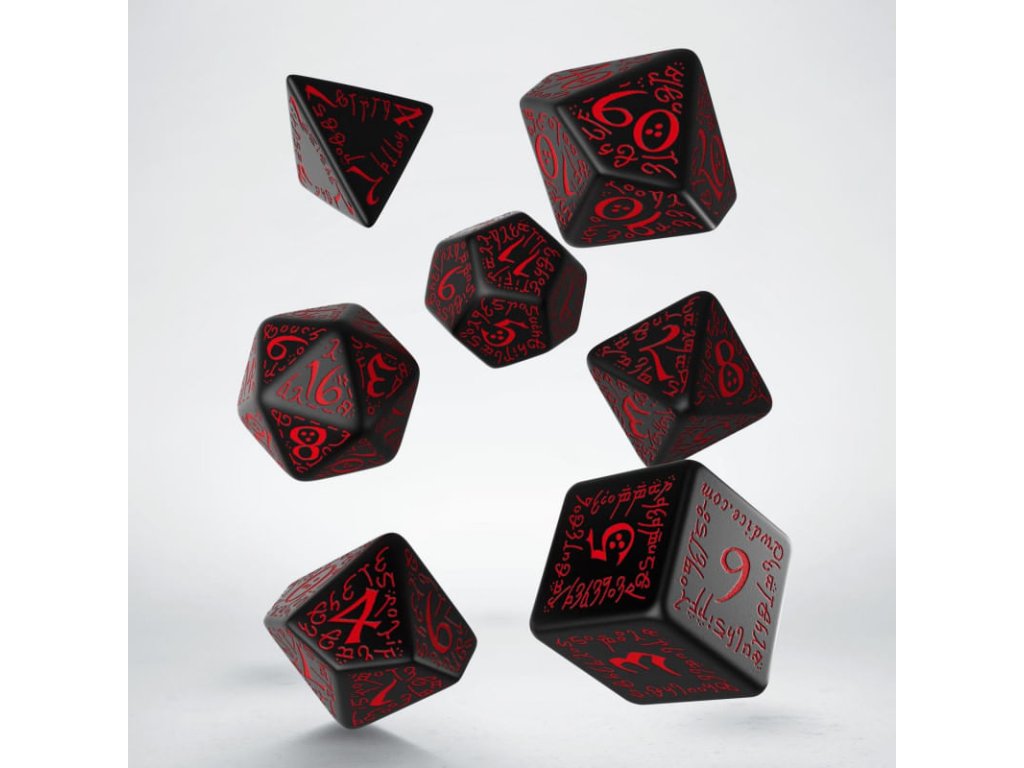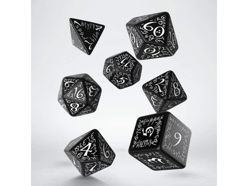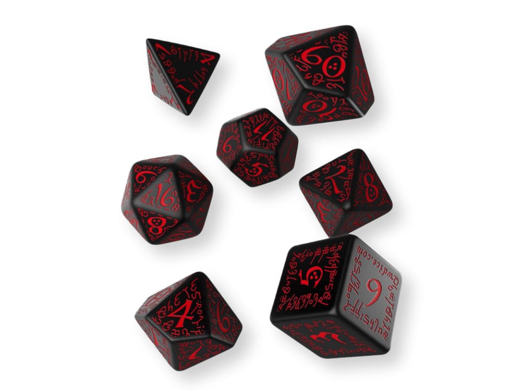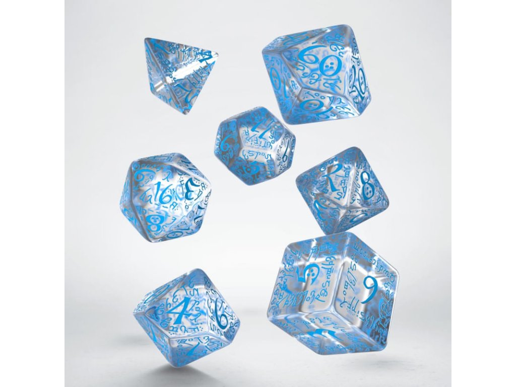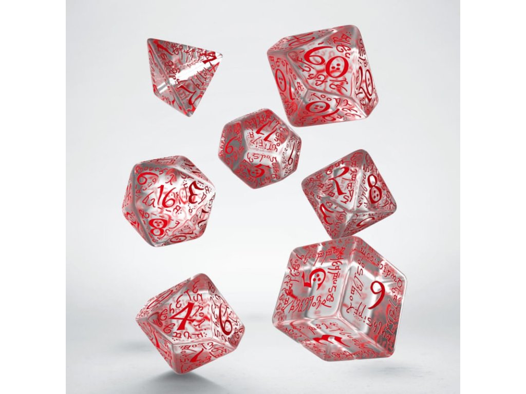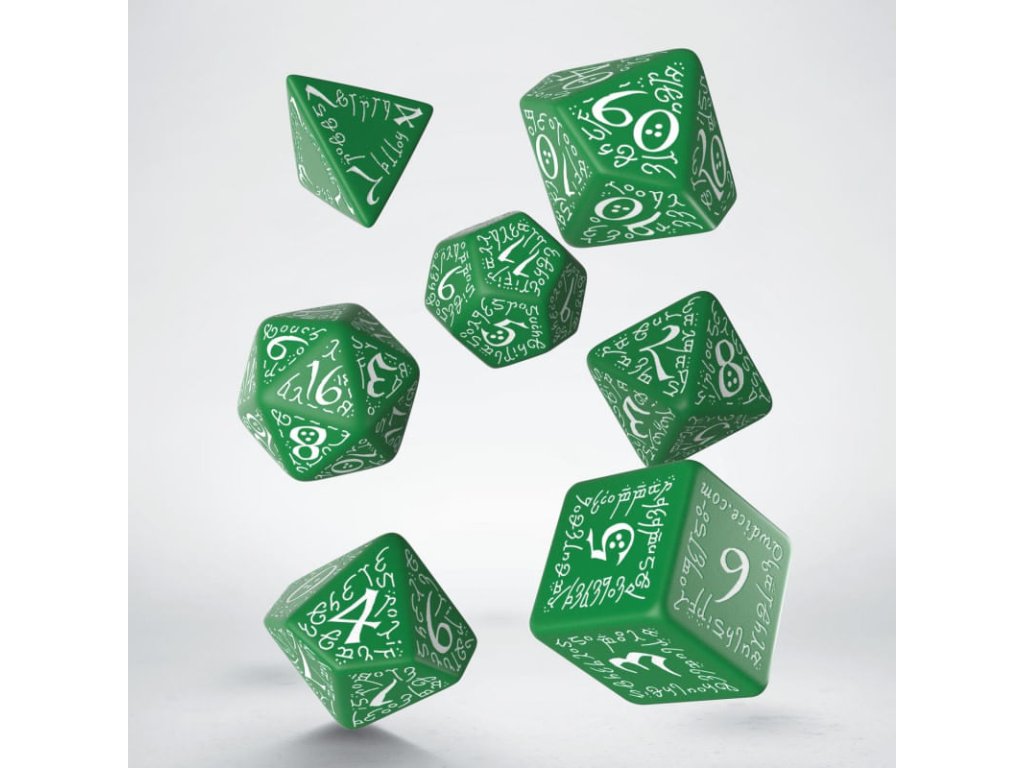 Sada nádherných kostek zdobených elfskými runami, nepostradatelný doplněk pro každého kráče, jemuž v žilách koluje alespoň kapka vznešené elfské krve. Sada obsahuje sedm kostek: čtyř, šesti, osmi, desíti, dvanácti, dvaceti stěnnou a procentovou kostku. Barvy jsou uvedeny vždy v pořadí barva podkladu-barva číslic.Diskusia