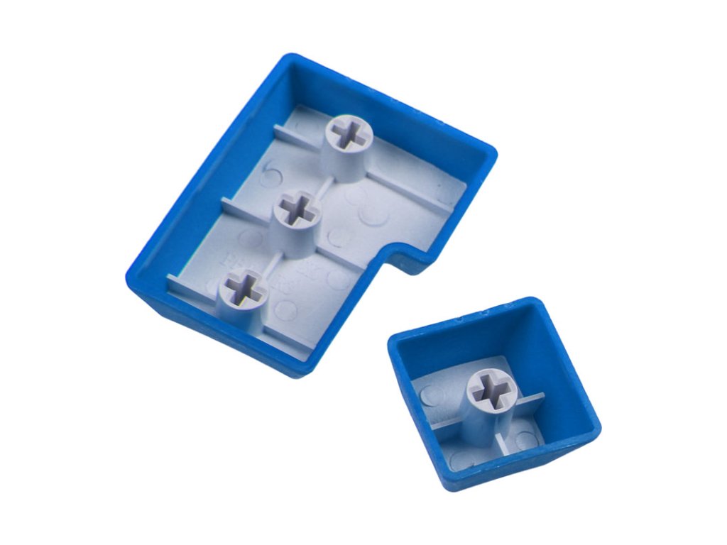 Jedenásť krytov tlačidiel jepoužitím metódy dvojitého záberu vyrába sa tvarovaním plastu okolo tvarovaného kusu kovu alebo plastu.