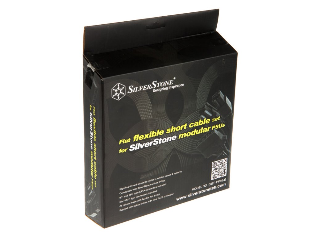 Okrem štýlových a vysokokvalitných hardvérových skríň ponúka spoločnosť SilverStone aj širokú škálu praktického a tiež veľmi dobre spracovaného počítačového príslušenstva.Ponúkaný PP05-E je sada deviatich čiernych páskových káblov, ktoré sú príjemne krátke a mimoriadne flexibilné. Sú vhodné ako alternatíva ku káblom dodávaným s modulárnymi napájacími jednotkami SilverStone.