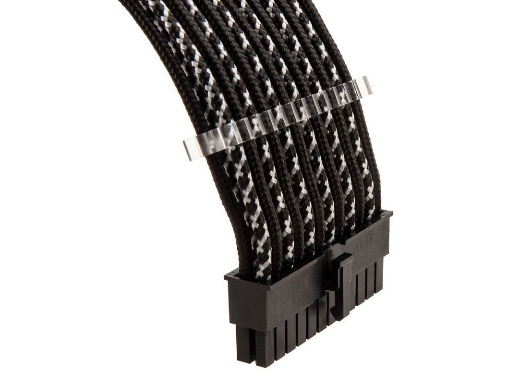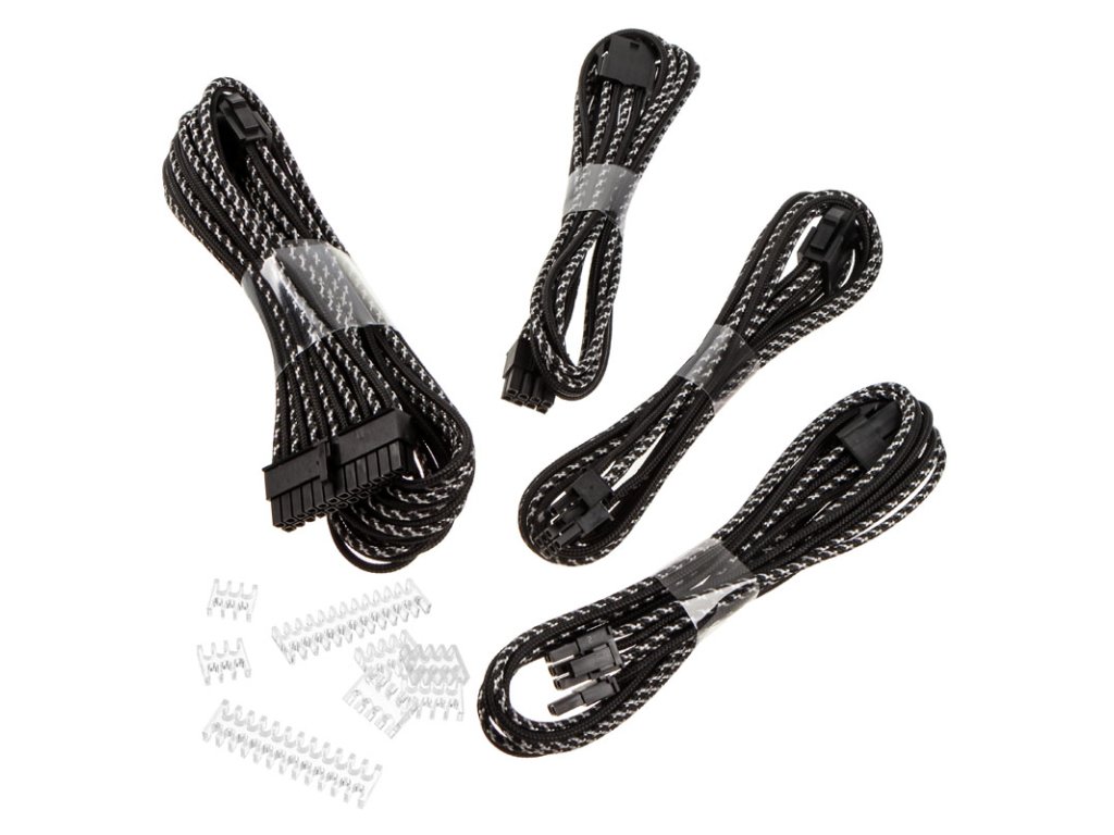 Táto sada predlžovacích káblov pozostáva z 24-pinového predlžovacieho kábla ATX12V pre základnú dosku, 4+4-pinového predlžovacieho kábla ATX12V/EPS12V pre procesor a dvoch 6+2-pinových predlžovacích káblov PCIe pre grafické karty. Táto súprava káblov obsahuje celkovo štyri napájacie káble s čiernym a strieborným puzdrom a čiernymi konektormi. Okrem toho sú súčasťou balenia dva 24-slotové, štyri 8-slotové a dva 6-slotové káblové hrebene. Pomocou nich možno dokonale zarovnať jednotlivé káble s puzdrami, čo na konci zanechá veľmi úhľadný dojem.Jednou zo špeciálnych vlastností káblov PHANTEKS je použitie polypropylénovej tkaniny na objímky. Tá je výrazne kvalitnejšia ako bežné plastové verzie, veľmi pevne tkaná, absolútne nepriehľadná a mäkká. Okrem toho je každý kábel individuálne uzavretý v puzdre.