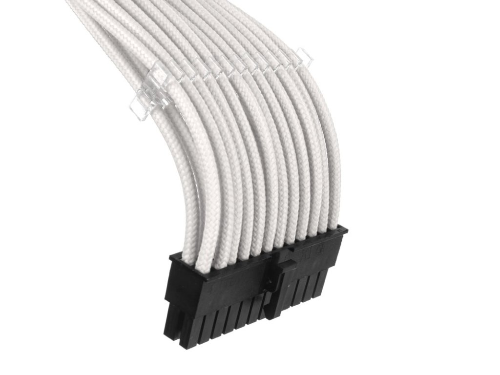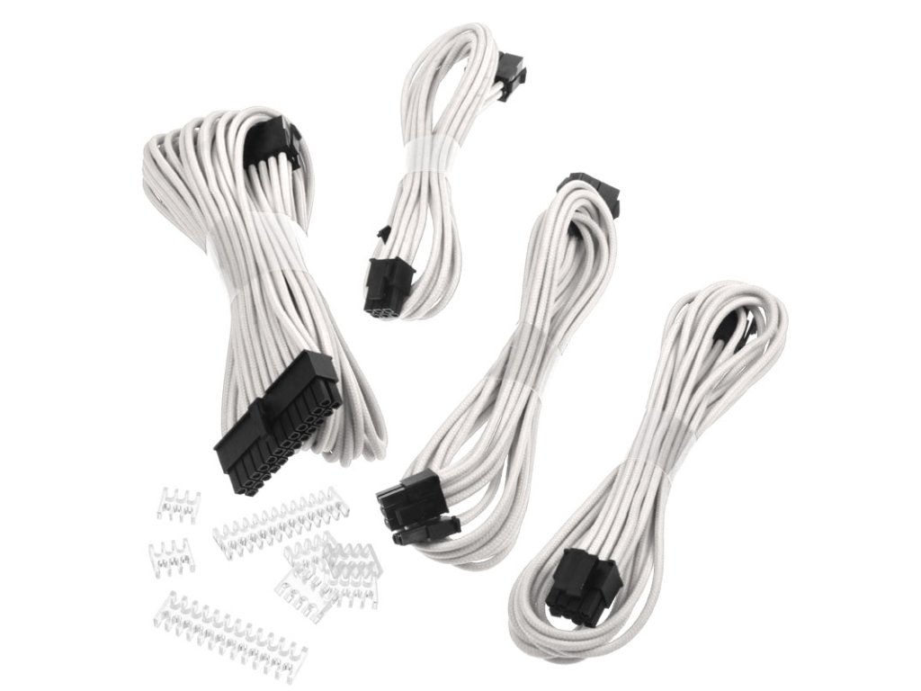 Táto sada predlžovacích káblov pozostáva z 24-pinového predlžovacieho kábla ATX12V pre základnú dosku, 4+4-pinového predlžovacieho kábla ATX12V/EPS12V pre procesor a dvoch 6+2-pinových predlžovacích káblov PCIe pre grafické karty. Táto súprava káblov obsahuje celkovo štyri napájacie káble s bielym puzdrom a čiernymi konektormi. Okrem toho sú súčasťou balenia dva 24-slotové, štyri 8-slotové a dva 6-slotové káblové hrebene. Pomocou nich možno dokonale zarovnať jednotlivé káble s puzdrami, čo na konci zanechá veľmi úhľadný dojem.Jednou zo špeciálnych vlastností káblov PHANTEKS je použitie polypropylénovej tkaniny na objímky. Tá je výrazne kvalitnejšia ako bežné plastové verzie, veľmi pevne tkaná, absolútne nepriehľadná a mäkká. Okrem toho je každý kábel individuálne uzavretý v puzdre.