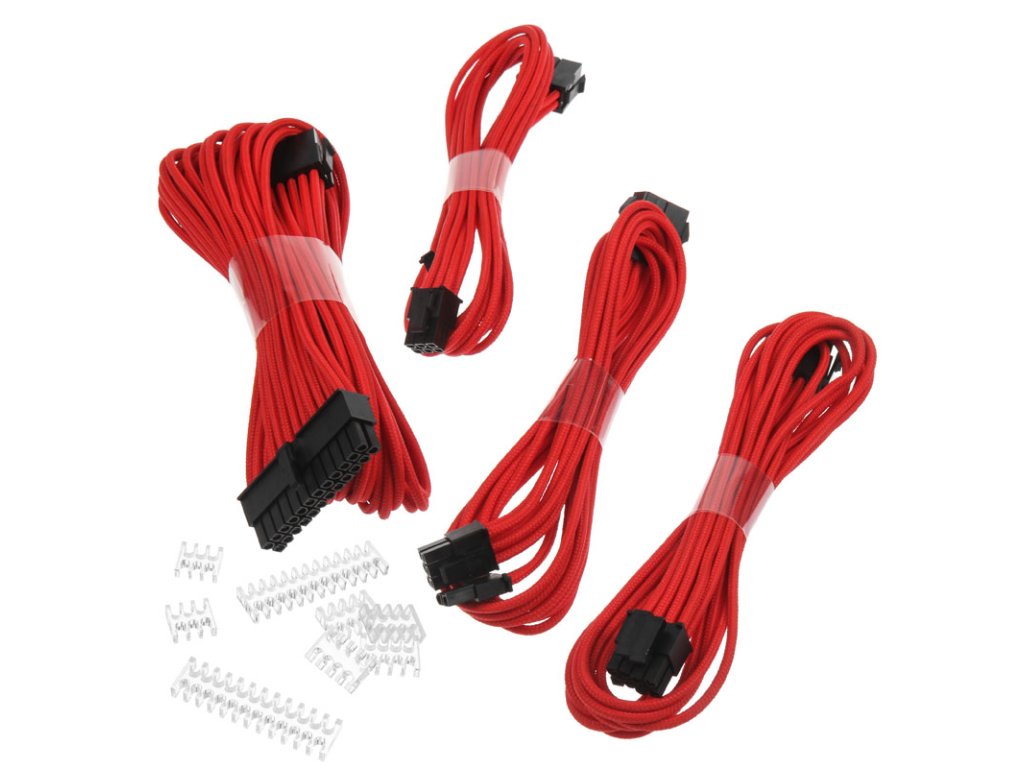 Táto sada predlžovacích káblov pozostáva z 24-pinového predlžovacieho kábla ATX12V pre základnú dosku, 4+4-pinového predlžovacieho kábla ATX12V/EPS12V pre procesor a dvoch 6+2-pinových predlžovacích káblov PCIe pre grafické karty. Táto súprava káblov obsahuje celkovo štyri napájacie káble s červeným puzdrom a čiernymi konektormi. Okrem toho sú súčasťou balenia dva 24-slotové, štyri 8-slotové a dva 6-slotové káblové hrebene. Pomocou nich možno dokonale zarovnať jednotlivé káble s puzdrami, čo na konci zanechá veľmi úhľadný dojem.Jednou zo špeciálnych vlastností káblov PHANTEKS je použitie polypropylénovej tkaniny na objímky. Tá je výrazne kvalitnejšia ako bežné plastové verzie, veľmi pevne tkaná, absolútne nepriehľadná a mäkká. Okrem toho je každý kábel individuálne uzavretý v puzdre.