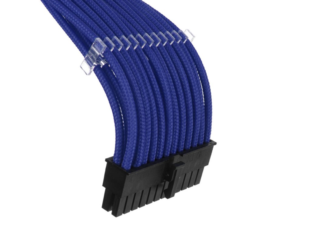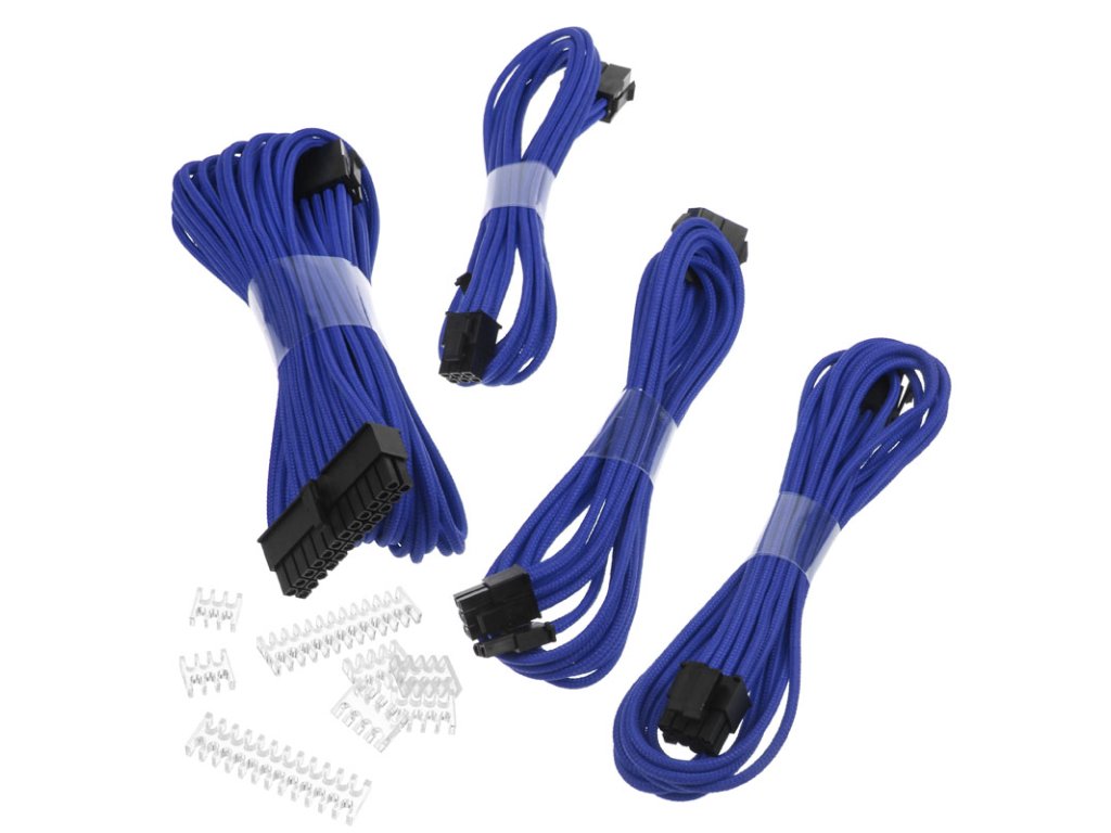 Táto sada predlžovacích káblov pozostáva z 24-pinového predlžovacieho kábla ATX12V pre základnú dosku, 4+4-pinového predlžovacieho kábla ATX12V/EPS12V pre procesor a dvoch 6+2-pinových predlžovacích káblov PCIe pre grafické karty. Táto súprava káblov obsahuje celkovo štyri napájacie káble s modrým puzdrom a čiernymi konektormi. Okrem toho sú súčasťou balenia dva 24-slotové, štyri 8-slotové a dva 6-slotové káblové hrebene. Pomocou nich možno dokonale zarovnať jednotlivé káble s puzdrami, čo na konci zanechá veľmi úhľadný dojem.Jednou zo špeciálnych vlastností káblov PHANTEKS je použitie polypropylénovej tkaniny na objímky. Tá je výrazne kvalitnejšia ako bežné plastové verzie, veľmi pevne tkaná, absolútne nepriehľadná a mäkká. Okrem toho je každý kábel individuálne uzavretý v puzdre.