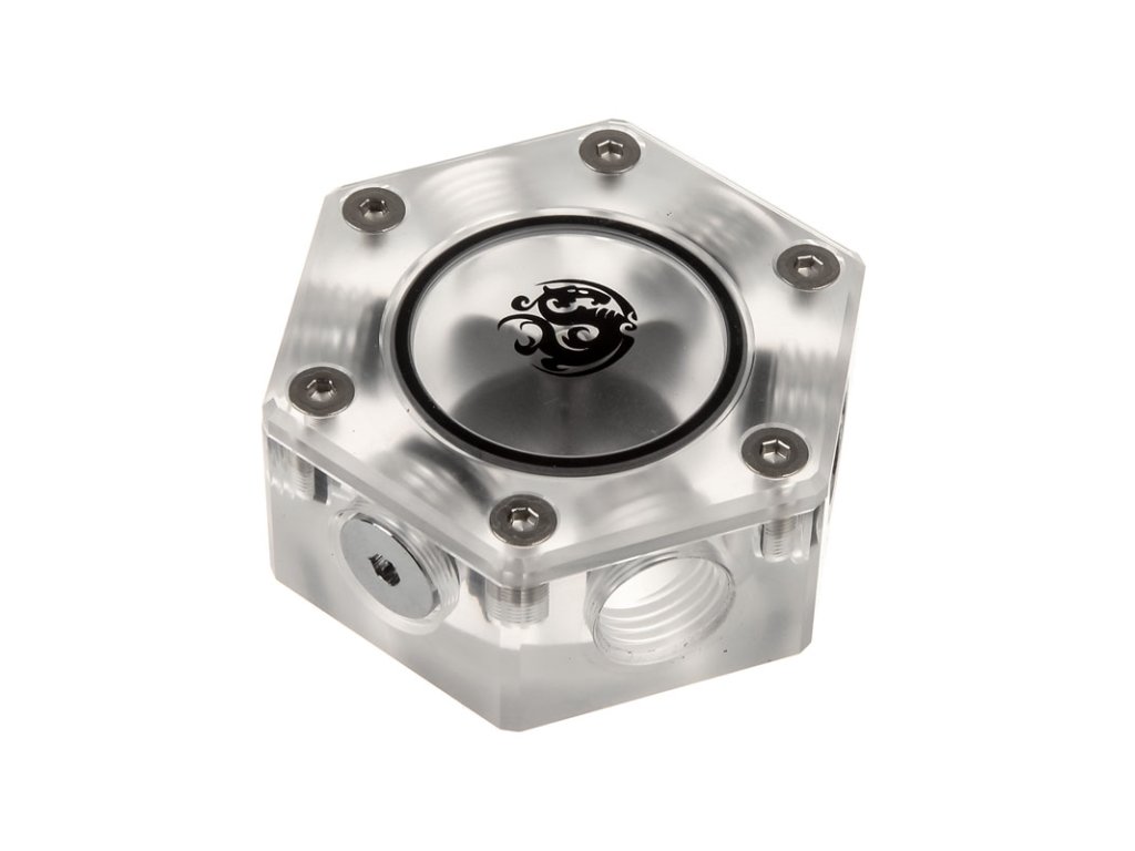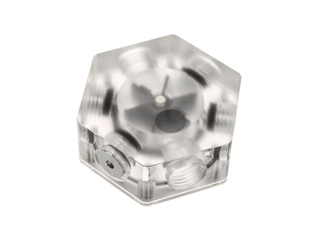 SŠesťhranný indikátor prietoku Bitspower ješesťhranný indikátor prietoku z adresypriehľadný akryl sšesť vnútorných závitov G1/4 palca. Chladiaca kvapalina prúdi cez indikátor prietoku a poháňajedno čierne lopatkové koleso že sje vybavená keramickým ložiskom. Všetkých šesť strán môže byť pripojených k systému vodného chladenia.Súčasťou balenia sú štyri uzávery pre nepoužívané pripojenia. Bitspowerzároveň dodáva aj zodpovedajúci imbusový kľúč.
