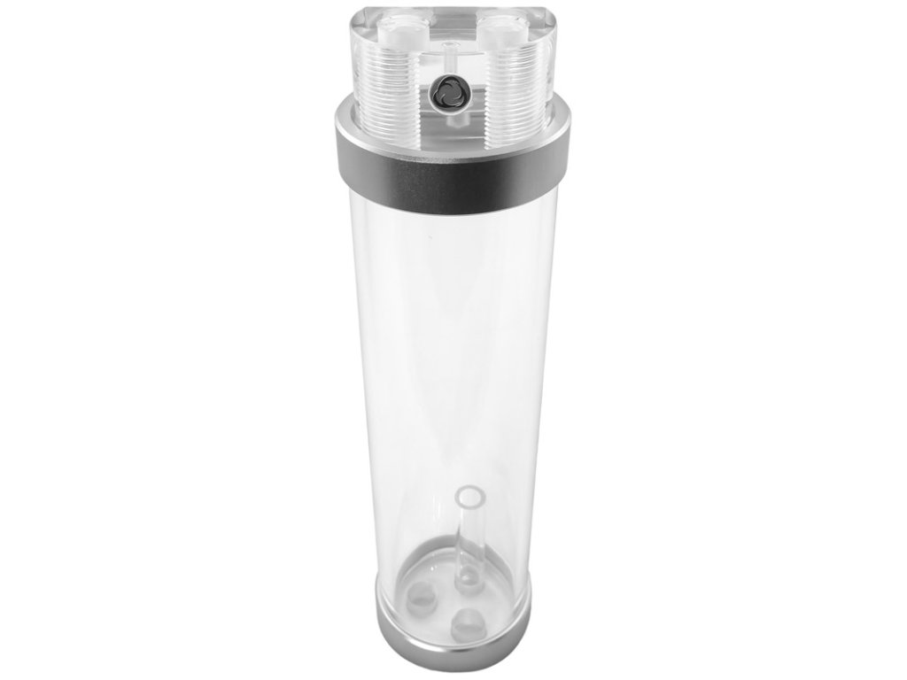 Expanzná nádrž Protium od spoločnostiPočítače Singularity dodáva sa s trubicou a tromi nástavcami. Nádržka s priemerom 60 mm, základňa a veko sú vyrobené z priehľadného akrylu. Strieborné hliníkové poistné krúžky držia koncovky na svojom mieste. Celkovo až sedem portov G1/4 poskytuje široké možnosti integrácie do vodného okruhu.Singularity Computers Protium Reservoir 200 mm na prvý pohľad: