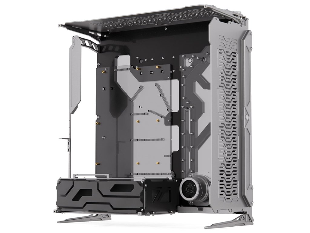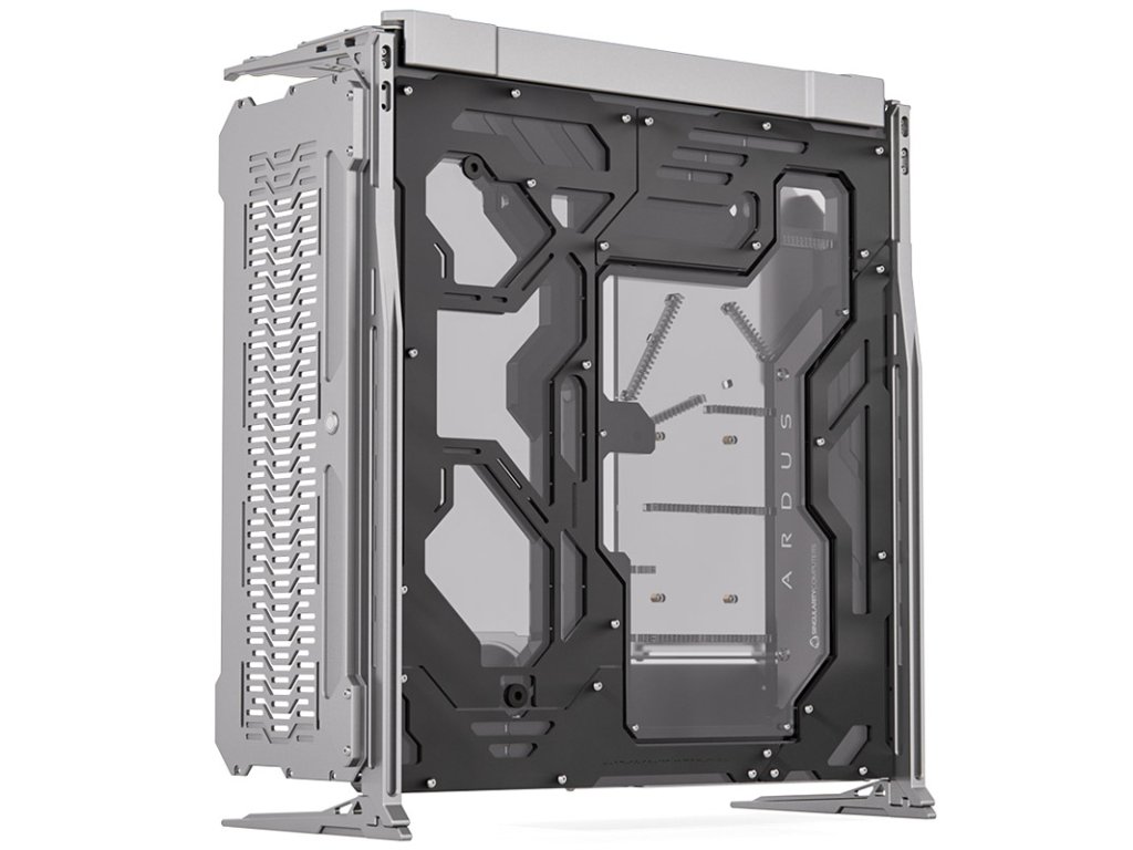 StránkaSingularity Computers Spectre 3.0 Ardus je veľká veža pre základné dosky XL-ATX s rozsiahlymi možnosťami inštalácieVlastné vodné chladenie. Puzdro máintegrovaná distribučná doskaktorý slúži ako zásobník na základnú dosku a je vyrobený z priehľadného akrylového skla.Strieborné vonkajšie panely sú vyrobené z hrubéhoCNC frézovaný hliník vyrobené. Vďaka početným vetracím otvorom umožňujú účinný odvod tepla. Celkovo môžu byťdva 360 mm radiátory inštalácia. Pomocou priloženého vertikálneho držiaka možno grafickú kartu namontovaťvoliteľný stúpací kábel nainštalované vertikálne a zobrazené.