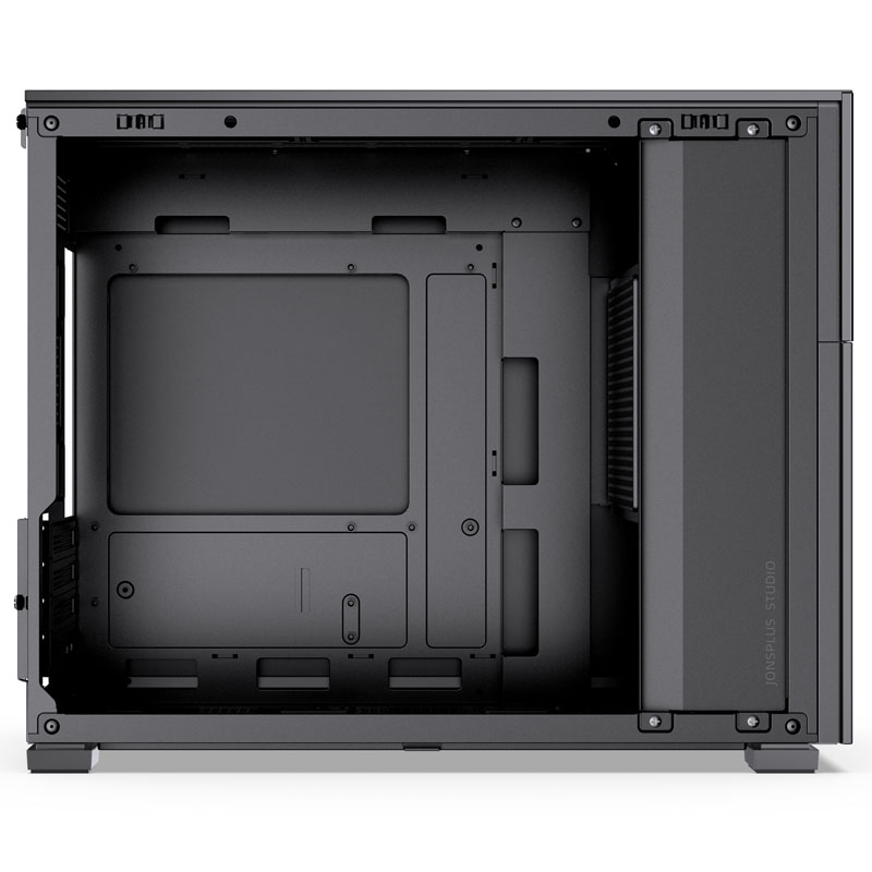 Vnútorný priestor chladničky Jonsbo D31 je dobre viditeľný cez bočný panel z tvrdeného skla. Okrem základnej dosky micro ATX sa do nej zmestí aj grafická karta s minimálnou dĺžkou 330 mm a maximálnou dĺžkou 400 mm. Napájaciu jednotku môžete tiež vertikálne presunúť o 140 mm v štyroch stupňoch za panel. Za šachtou základnej dosky je priestor pre dva disky SSD. K dispozícii je aj dostatok priestoru na správu káblov. Pevný disk je možné umiestniť vpredu na základňu bez tretieho ventilátora.Dostatok priestoru pre fanúšikov..