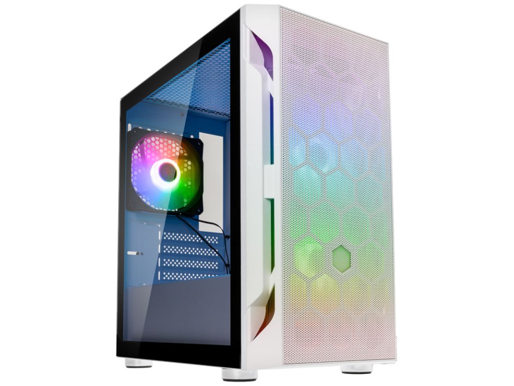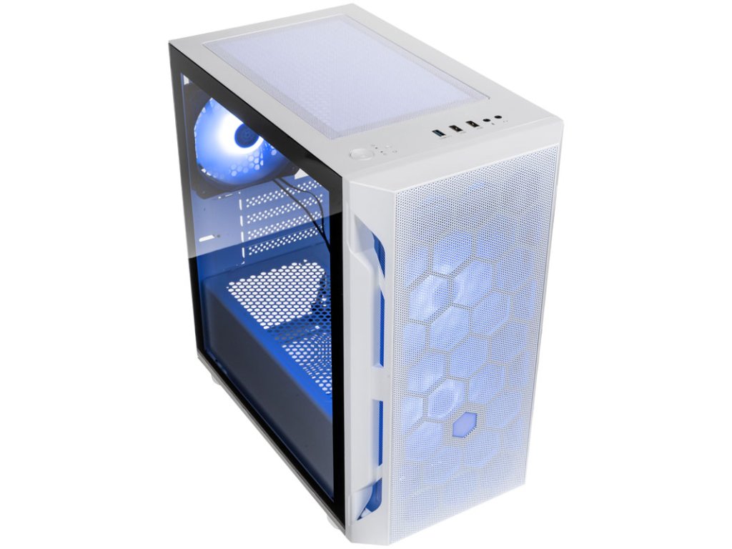 Panel I/O vám poskytuje rýchly a jednoduchý prístup kjeden port USB 3.0adva porty USB 2.0. Ak sa počítač zavesí alebo ho chcete rýchlo reštartovať z iného dôvodu, nájdete tu aj tlačidlo na tento účel. K dispozícii je aj HD zvuk! Možno pripojiť mikrofón a slúchadlá.Vylepšite svoj vzhľad pomocou osvetlenia RGB