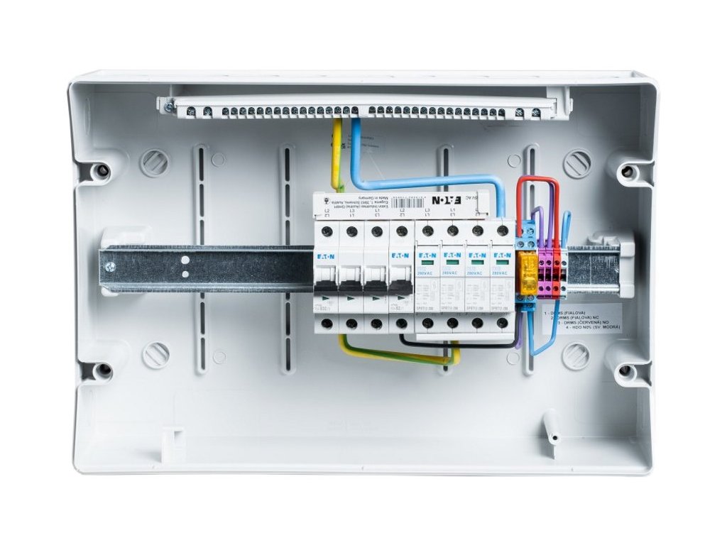 V rozvaděči je osazen svodič přepětí AC T1+T2, jistič B32/3 pro jištění vstupu do střídače a jistič B2/1, který jistí PATICI/RELE Finder, které zajišťuje N0% pro splnění podmínek distribucí (součástí je jak NC, tak NO kontakt a střed). Tím je zajištěno použití pro všechny typy měničů na trhu.