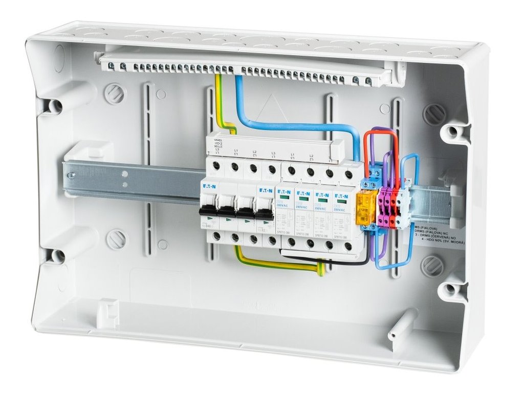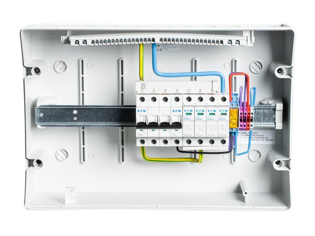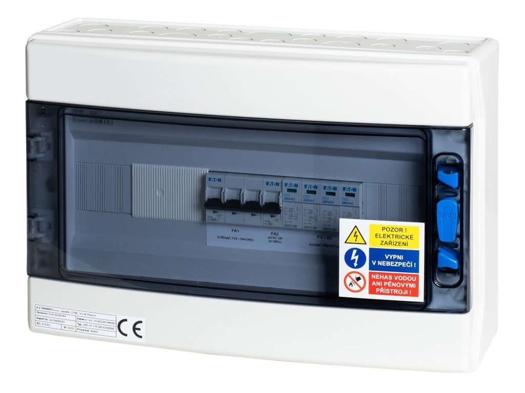 V rozvaděči je osazen svodič přepětí AC T1+T2, jistič B40/3 pro jištění vstupu do střídače a jistič B2/1, který jistí PATICI/RELE Finder, které zajišťuje N0% pro splnění podmínek distribucí (součástí je jak NC, tak NO kontakt a střed). Tím je zajištěno použití pro všechny typy měničů na trhu.