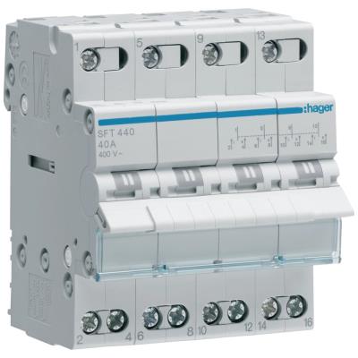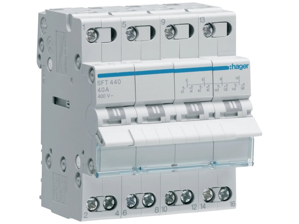 Čtyřpólový skupinový přepínač Hager SFT440 s jmenovitým proudem 40 A pro přepínání mezi dvěma napájecími zdroji.