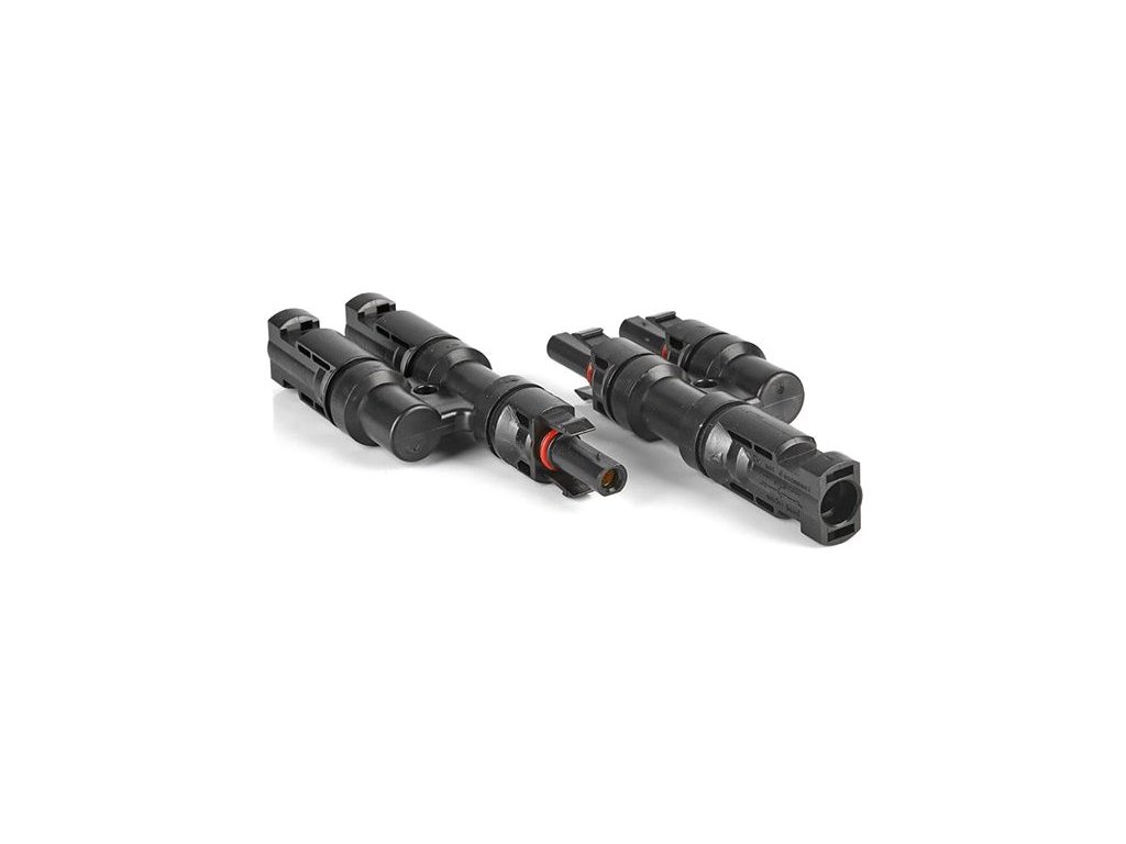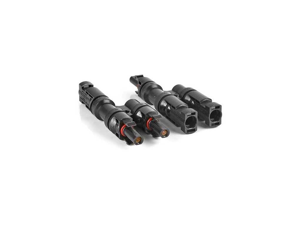 Rozbočovací solární T konektor typu MC4 určený pro paralelní propojení solárních panelů. Je vyroben z vysoce odolného plastu a je opatřen gumovými těsnícími vložkami. Vhodný i pro venkovní aplikace.
