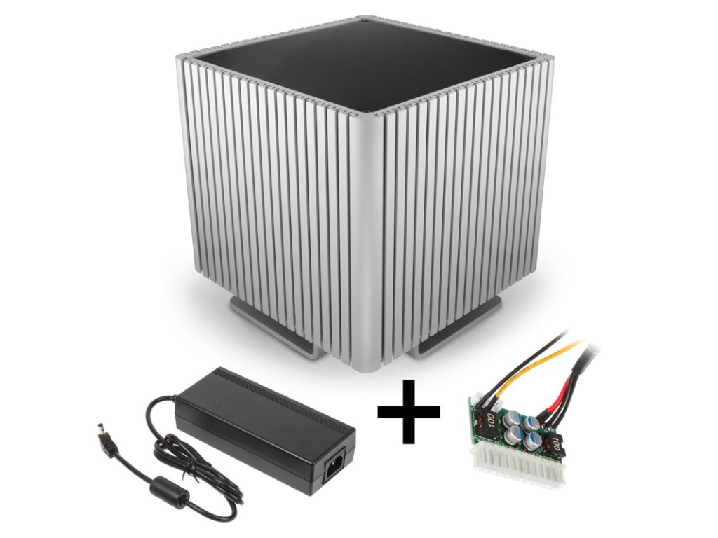 Súprava pozostávajúca z externého AC-DC adaptéra (12 V napájanie notebooku) a internej dosky DC-DC meniča je kompletne pasívne chladená, a preto pracuje úplne ticho. Malá doska s obvodmi vysoko účinnej 160-wattovej napájacej jednotky sa jednoducho pripája priamo na 24-pinový konektor ATX12 základnej dosky. Oba komponenty sú pripojené pomocou dutého konektora a príslušnej zásuvky. Zásuvka vedie z internej dosky meniča približne 40 cm dlhým káblom, ktorý možno pomocou zalomenej matice pripevniť na spodnú stranu krytu, kam sa zasúva kábel z externého adaptéra.Technické údaje (balík)