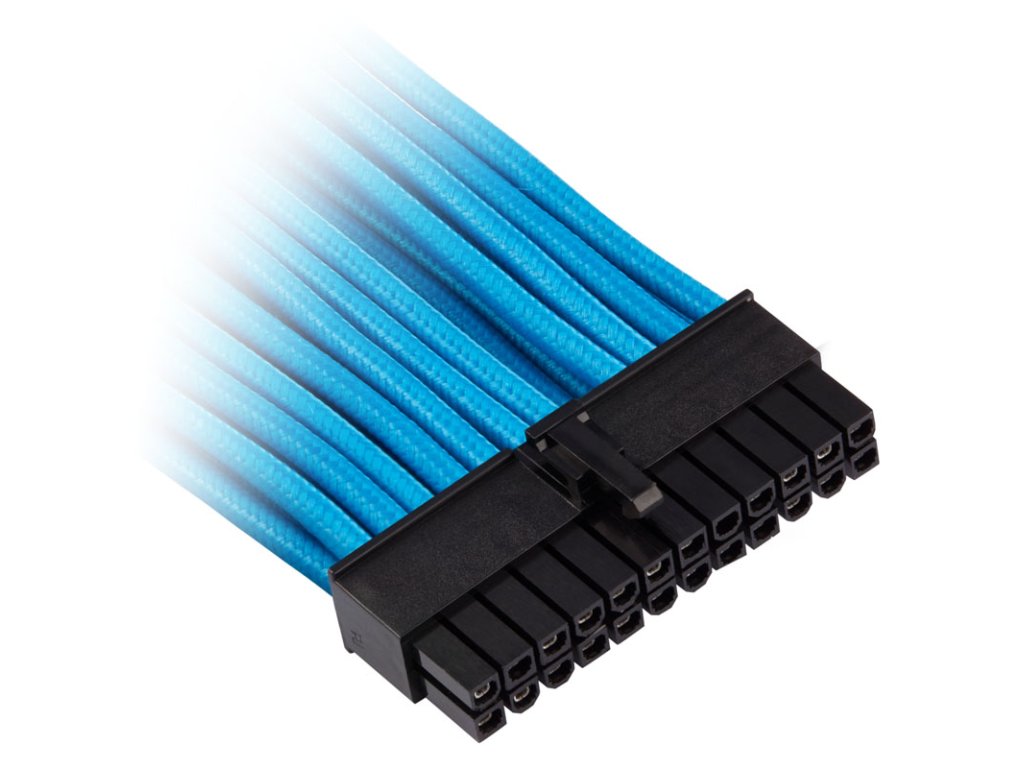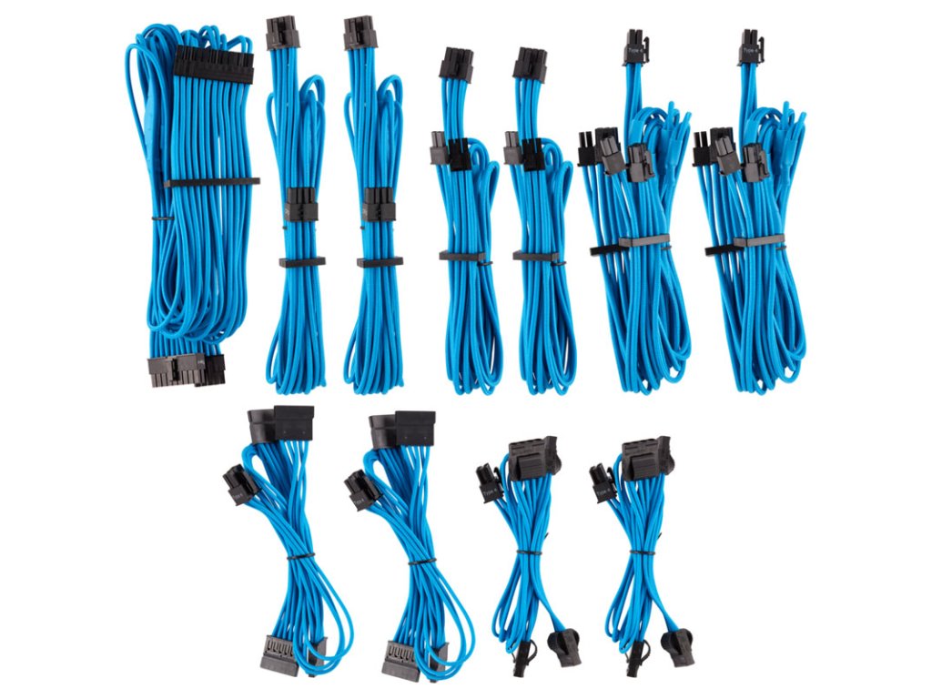 Táto súprava káblov pozostáva zjedenásť napájacích káblov s plášťomktorébez nevzhľadných teplom zmršťovaných hadičiek boli pripojené k zástrčkám. Pre čo najlepší vzhľad je každý káblový zväzok samostatne pokrytý nepriehľadným a pevným opleteným plášťom zvysokokvalitný materiál paracord v modrej farbe rukávy. Samotné spoje sú vyhotovené v čiernej farbe, aby vytvárali elegantný kontrast a jednotný dizajn.Na vyrovnanie napätia 12-voltovej koľajnice boli káble čiastočne pokrytédodatočne integrované kondenzátory vybavené. Sada káblov je kompatibilná s napájacími zdrojmi Corsair zo sérií RMi, RMx a HX (Platinum) a dosahujemaximálna bezpečnosťpri pripájaní napájacej jednotky k iným hardvérovým komponentom.