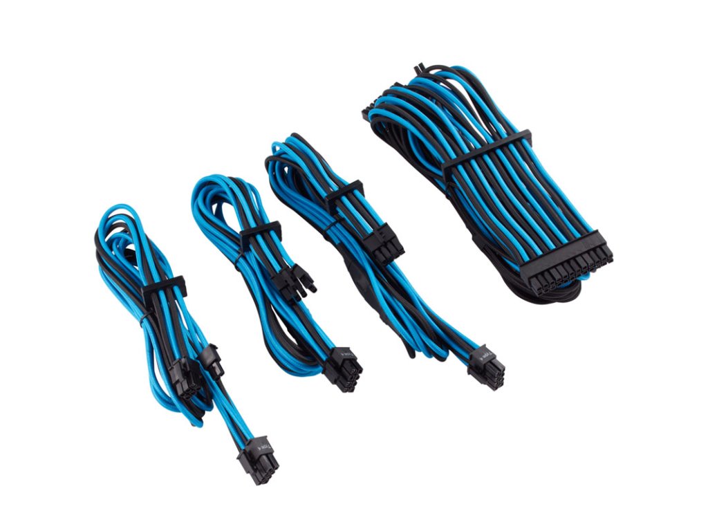 Táto súprava káblov sa skladá z celkovo štyroch napájacích káblov s modrými a čiernymi objímkami, ktoré boli pripojené ku konektorom bez nevzhľadných teplom zmršťovaných objímok. Na dosiahnutie čo najlepšieho vzhľadu bol každý zväzok káblov samostatne pokrytý nepriehľadným a pevným opleteným puzdrom zvysokokvalitný materiál paracord v modrej a čiernej farbe rukávy. Samotné spoje sú vyhotovené v čiernej farbe, čím vytvárajú elegantný kontrast a štýlový dizajn.Na vyrovnanie napätia 12-voltovej koľajnice boli káble čiastočne pokrytédodatočne integrované kondenzátory vybavené. Sada káblov je kompatibilná s napájacími zdrojmi Corsair zo sérií RMi, RMx a HX (Platinum) a dosahujemaximálna bezpečnosťpri pripájaní napájacej jednotky k iným hardvérovým komponentom.