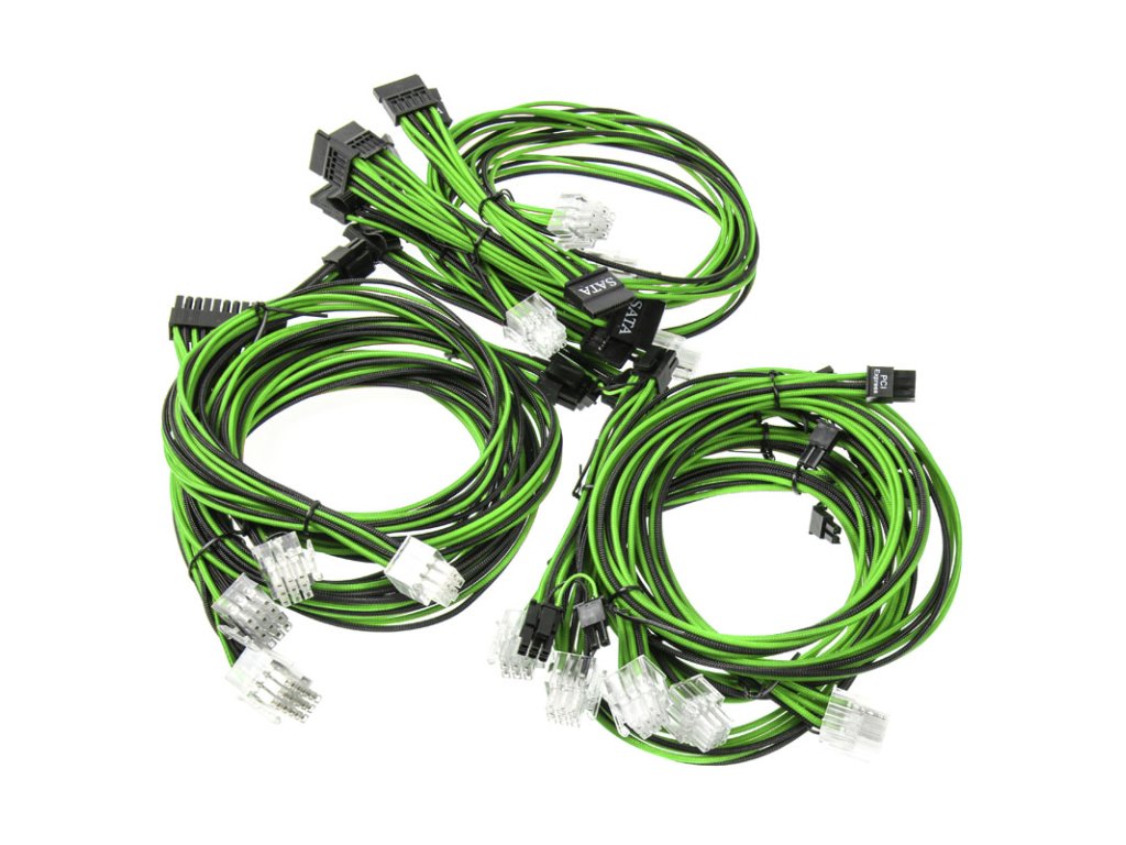 Čierno-zelená súprava káblov, ktorú tu ponúkame, je súprava celkovo 12 káblov, ktorých jednotlivé vodiče sú obalené čiernou a zelenou textilnou tkaninou. Súprava je plne kompatibilná s napájacími jednotkami Super Flower radu Leadex 80 PLUS Gold s výkonom 550/650/750/850/1000/1300 W a Leadex 80 PLUS Platinum s výkonom 550/650/750/850/1000/1200 W, ako aj Leadex II 80 PLUS Gold s výkonom 650/750/850/1000/1200 W. V obmedzenej miere sú kompatibilné aj napájacie zdroje Super Flower Golden Silent 80 PLUS Gold a Platinum. Keďže však ide o polomodulárne napájacie jednotky, pevné káble nie je možné vymeniť. Inak zväzky káblov presne zapadajú do zásuviek, ktoré sú k dispozícii na napájacej jednotke. Presný počet káblov a prípojok, ako aj ich dĺžku nájdete v technických údajoch.