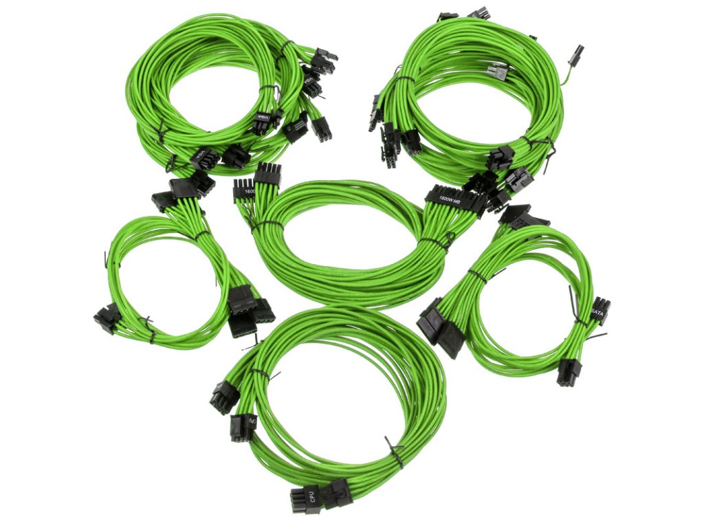 Tu ponúkaná súprava zelených káblov je súprava celkovo 15 káblov, ktorých jednotlivé vodiče sú obalené zelenou textilnou tkaninou. Súprava je kompatibilná so zdrojmi Super Flower zo sérií Leadex Titanium, Leadex Platinum a Leadex Gold a tiež so zdrojmi EVGA zo sérií SuperNOVA T2, SuperNOVA P2, SuperNova G2 a SuperNova G3. Presný počet káblov a pripojení, ako aj ich dĺžku nájdete v technických údajoch.