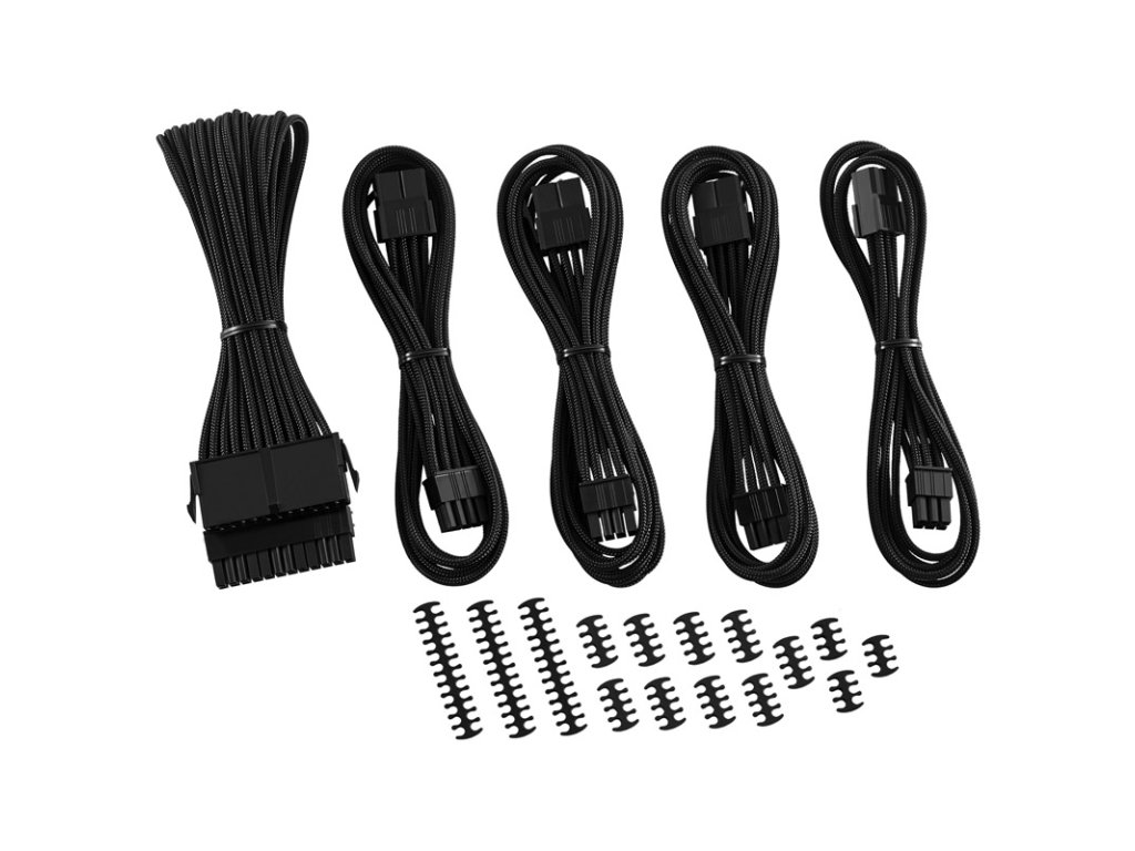 Káble obsahujú celkomjeden 6-pinový a jeden 8-pinový kábel PCIe pre grafické karty a24-pinový kábel ATX, ako aj 8-pinový a 4+4-pinový kábel EPS12V/ATX12V na napájanie základnej dosky a procesora. Rozsah dodávky zahŕňaHrebene na káble pre dokonale vyrovnané vodiče. Tým je zaručená absolútne čistá konštrukcia kábla.