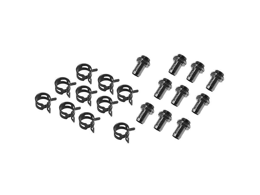 Na pripojenie jednotlivých komponentov vodného chladenia je nevyhnutné zvoliť správne prípojky a ich dostatočný počet. S týmto balíkom je inštalácia jednoduchá, najmä preto, že v porovnaní s jednotlivými nákupmi sa poskytuje zľava.Súčasťou dodávky je desať čiernych poniklovaných zástrčkových spojok (armatúr) a desať čiernych hadicových svoriek. Prípojky Bitspower majú závit G1/4 palca a sú určené pre hadice s vnútorným priemerom 10 mm.
