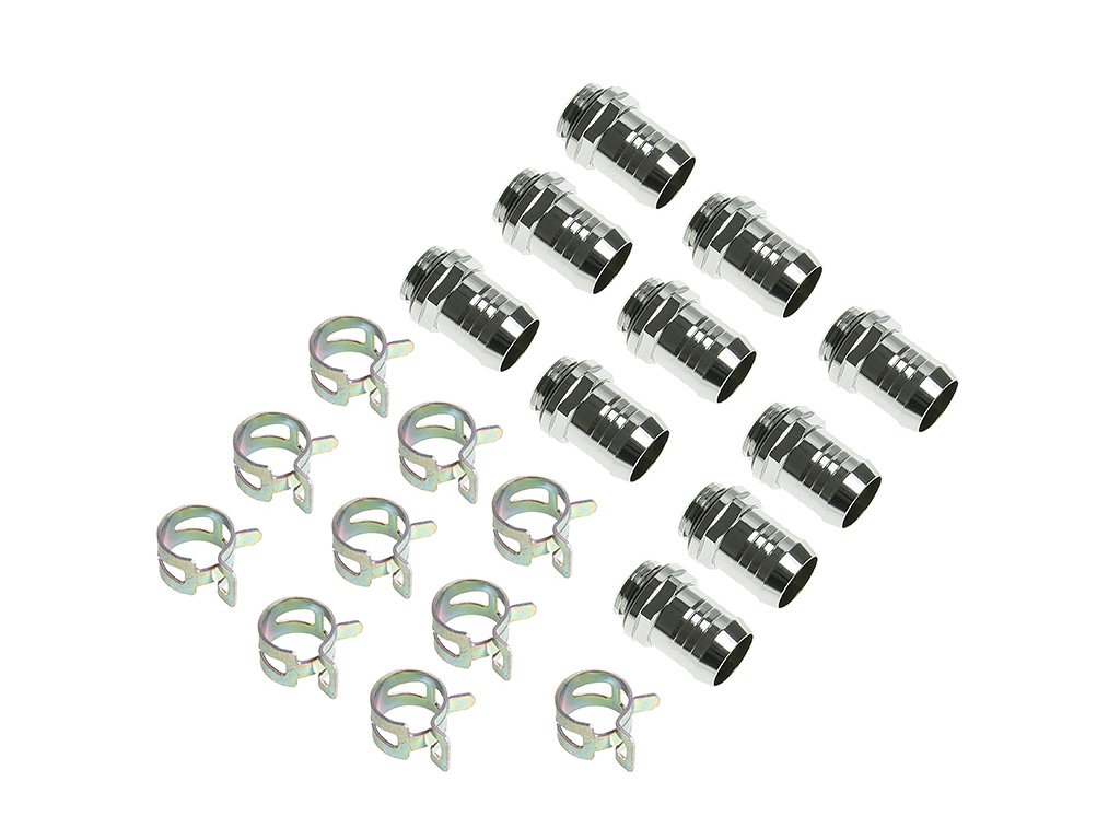 Na pripojenie jednotlivých komponentov vodného chladenia je nevyhnutné zvoliť správne prípojky a ich dostatočný počet. S týmto balíkom je inštalácia jednoduchá, najmä preto, že v porovnaní s jednotlivými nákupmi sa poskytuje zľava.Súčasťou dodávky je desať strieborných poniklovaných zásuvných spojov (armatúr) a desať strieborných hadicových svoriek. Prípojky Bitspower majú závit G1/4 palca a sú určené pre hadice s vnútorným priemerom 13 mm.