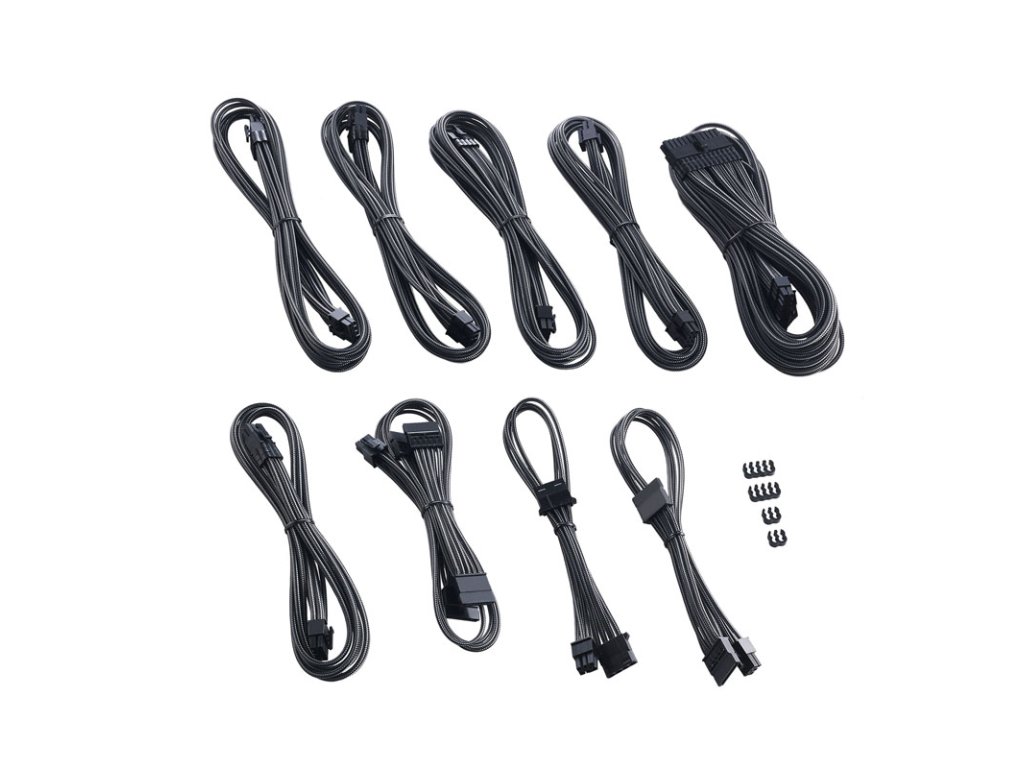Káble obsahujú celkomdva 8-pinové káble PCIe každý s jednýmJeden 8-pinový konektor. A24-pinový kábel ATX, ako aj 4+4-pinový a 8-pinový kábel EPS12V/ATX12V na napájanie základnej dosky a procesora. Sada obsahuje aj celkom dva káble SATA, každý s dvoma prípojkami, na napájanie ďalších hardvérových komponentov. Súčasťou dodávky sú dva kábledva 8-drážkové a dva 4-drážkové káblové hrebene možno použiť aj na dokonale paralelne usporiadané žily a vytvoriť tak absolútne čistý dizajn kábla.