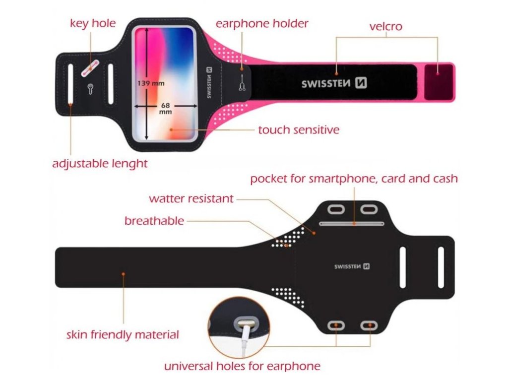 Pouzdro na paži SWISSTEN ArmBand 7" je určeno pro všechny běžce a aktivní sportovce. Jedná se o ideální doplněk pro monitoring vašeho tréninku skrze chytré mobilní aplikace, poslech hudby (otvor pro sluchátka) nebo přijímání hovorů během cvičení nebo aktivního pohybu.