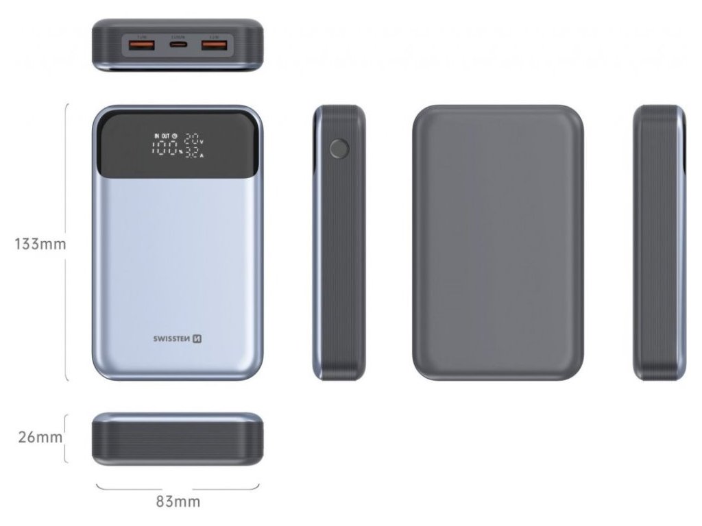 Nabízí trojici různých výstupů, takže lze dobíjet až 3 zařízení současně a hlavně rychle. I při čekání na vlak nebo na oběd v restauraci můžete doplnit energii také váš přístroj. Powerbanka SWISSTEN 100 W Power Delivery nabízí praktický LCD displej, který vám zprostředkuje základní informace – například kolik procent energie v powerbance zbývá, hodnotu napětí a proudu.
