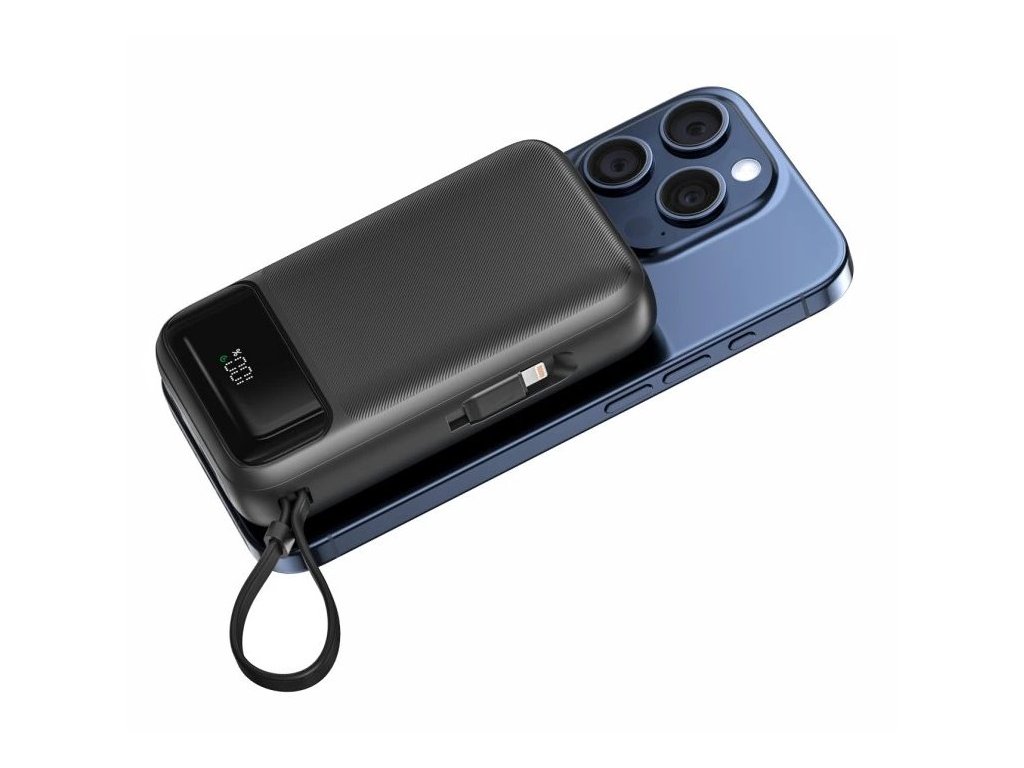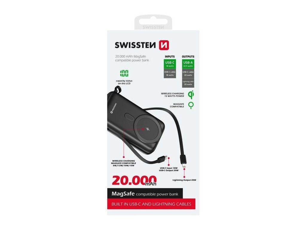 SWISSTEN powerbanka s MagSafe a kabely USB-C/Lightning 20000 mAhPowerbanka s kapacitou 20 000 mAh, se kterou již nebudete muset řešit žádné kabely. Nabízí dva integrované kabely s konektory USB-C a Lightning, a navíc i bezdrátové dobíjení pomocí technologie Qi či MagSafe. Výhodou je, že powerbanka vůči její kapacitě nezabírá velké množství místa (129 × 73 × 30 mm).