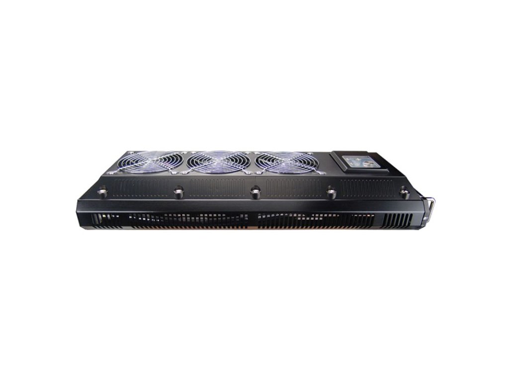 Vďaka čiernemu a hranatému dizajnuKoolance EX2-1055 dokonca aj v obývacej izbe. Vďaka pogumovaným nožičkám možno systém vodného chladenia umiestniť aj priamo na počítačovú skriňu.Tri 120 mm ventilátory sedieť na veľkej360 mm hliníkový radiátor. Výkonné vodné čerpadlo pracuje sprietok až 270 l/h. Celkovo systém poskytuje ažchladiaci výkon 900 W pripravené. Nádržka pojme celkovo 142 mililitrov a stav naplnenia možno odčítať cez malé osvetlené okienko. Podobnepodsvietený displej LED zobrazuje teploty a iné hodnoty systému a umožňuje prístup k nastaveniam ventilátora a čerpadla.